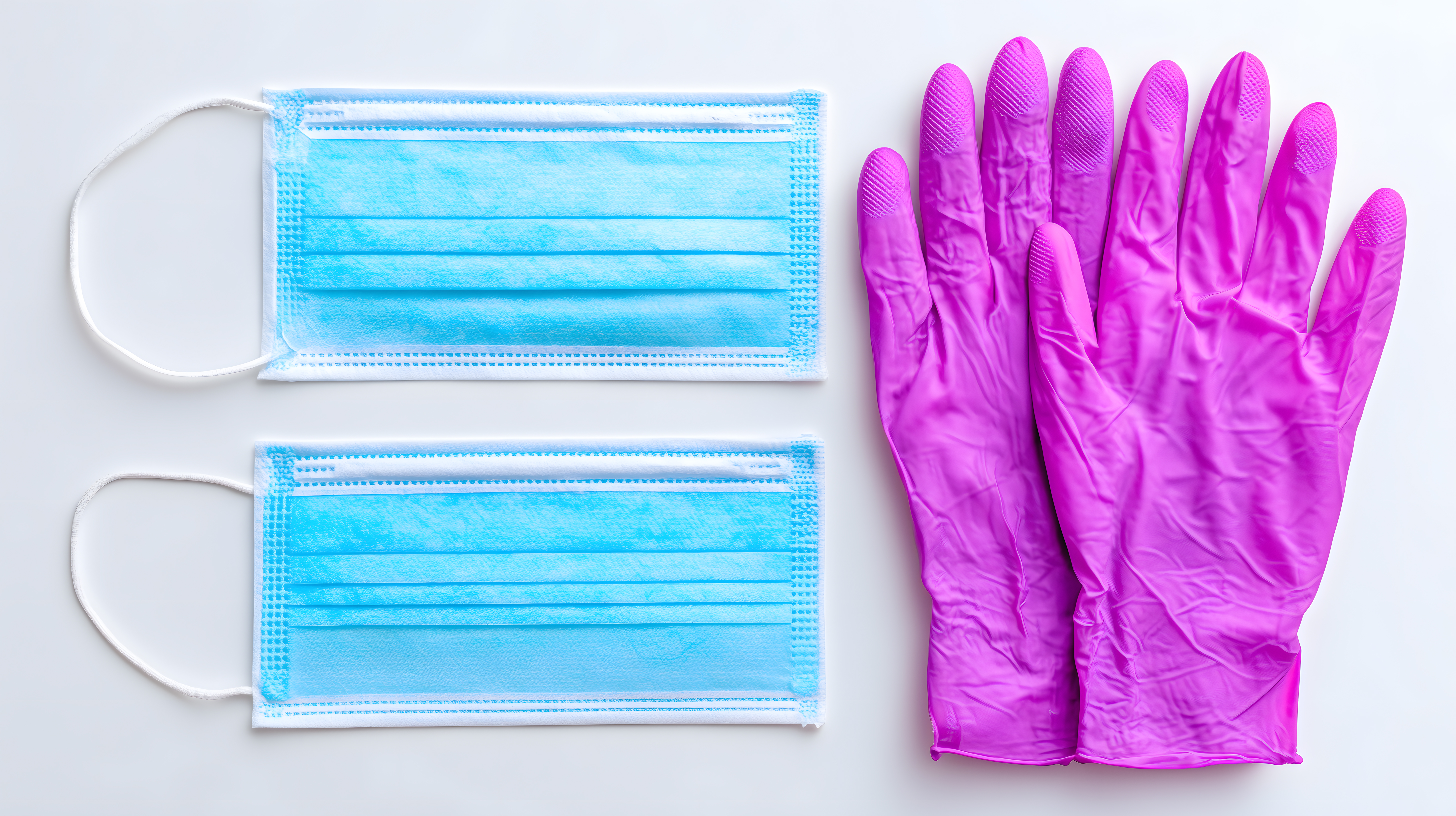 Das Bild zeigt eine Draufsicht auf medizinische Ausrüstung wie chirurgische Einwegmasken und violette Gummihandschuhe auf einem weißen Hintergrund. Die Farbpalette ist klar und kontrastreich, mit den hellen Blautönen der Masken und den leuchtenden Lila-Tönen der Handschuhe. Die Komposition ist symmetrisch und minimalistisch, was eine saubere, professionelle Optik erzeugt.