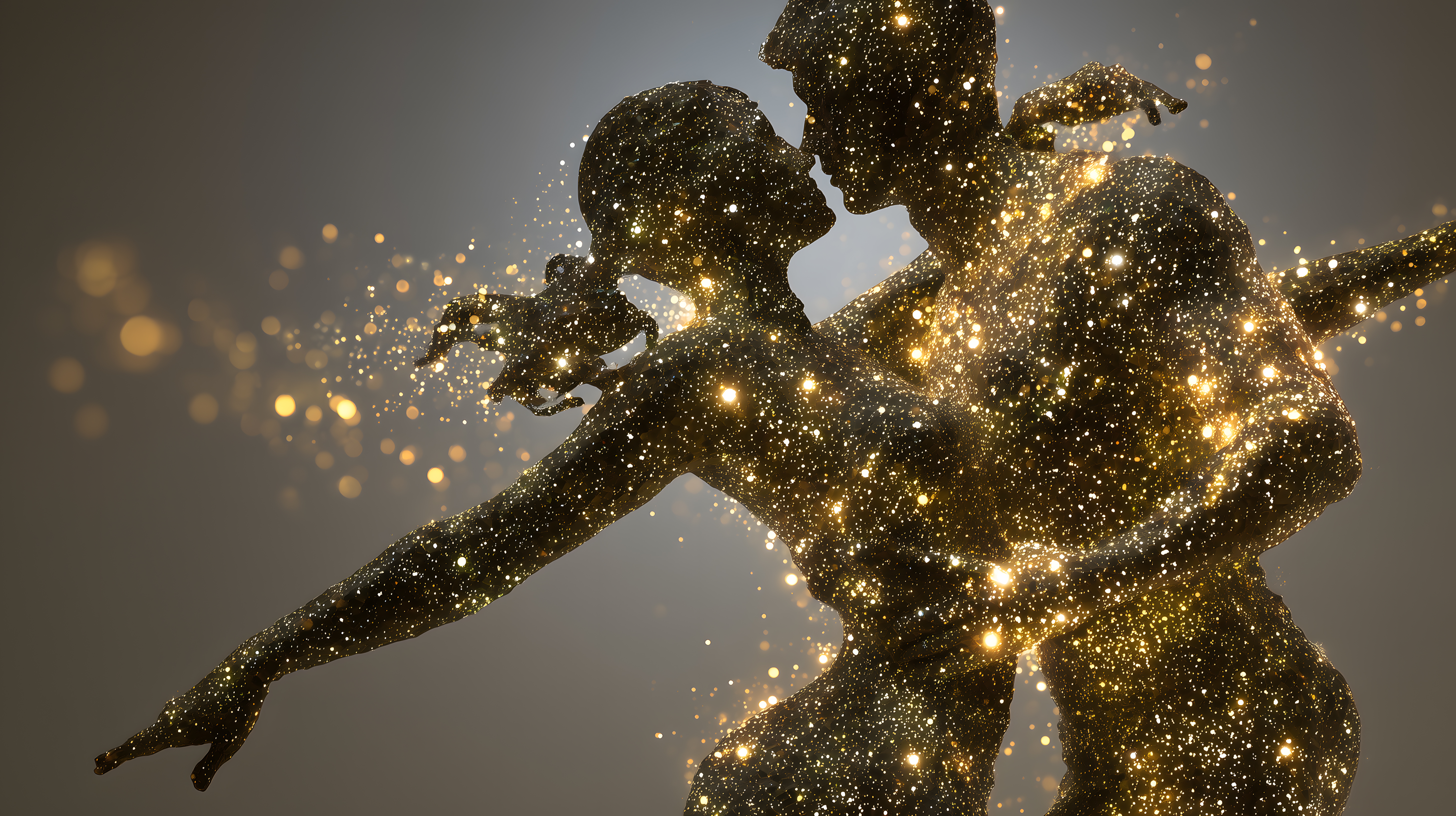 Das Bild zeigt die silhouettenhafte Darstellung einer Tänzerin, die von einem Glitzersturm umhüllt ist. Der Körper der Tänzerin ist in einem goldenen Funkeln gehüllt, das den Betrachter in eine faszinierende, fast magische Atmosphäre versetzt. Die Komposition ist so angelegt, dass die Bewegung und Dynamik der Tänzerin im Mittelpunkt stehen. Die dunkle Hintergrundfarbe lässt die goldenen Funken umso stärker hervortreten und verleiht dem Bild eine luxuriöse Ausstrahlung.