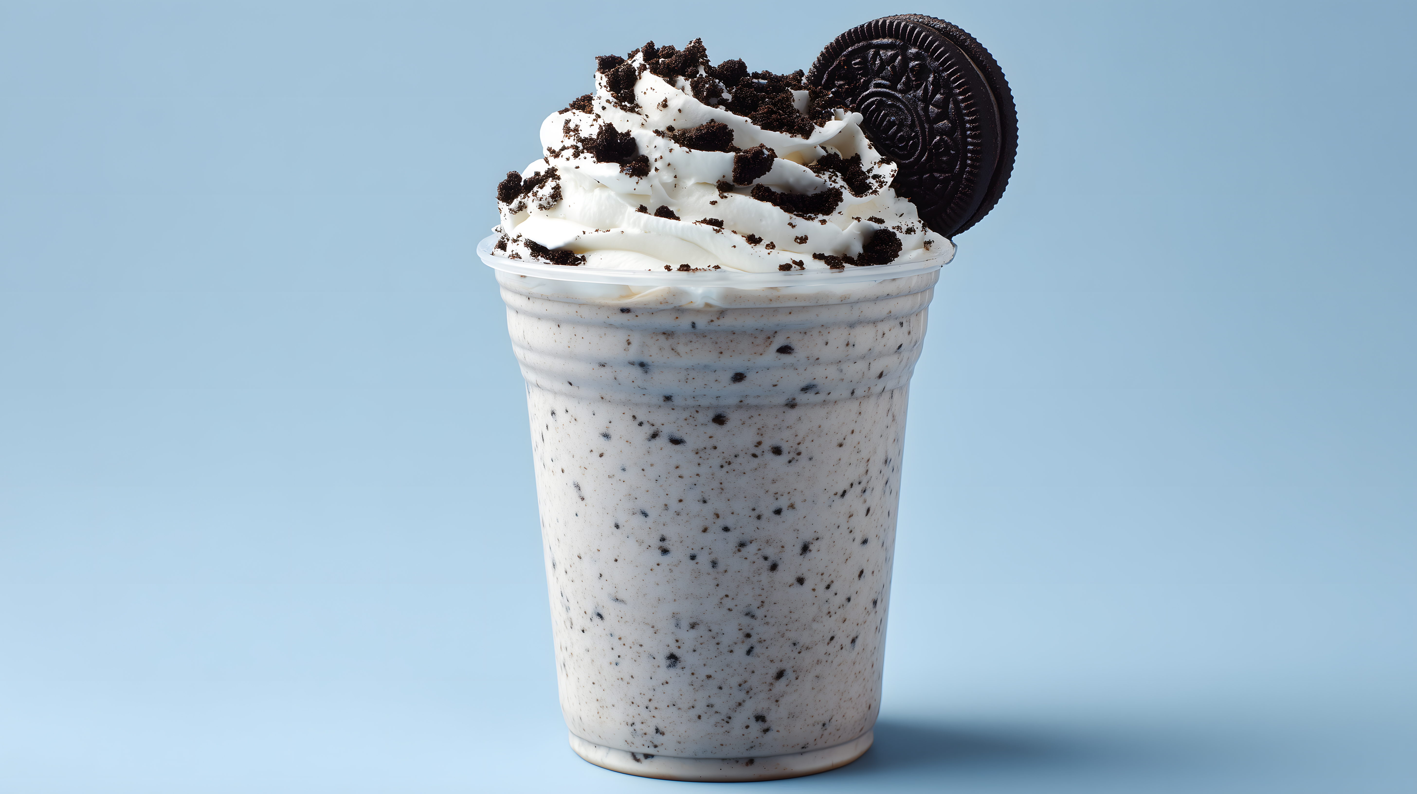 Das Bild zeigt einen überlaufenden Milchshake, garniert mit zerbröselbten Oreo-Keksen und einem ganzen Keks als Krönung. Der Milchshake ist in einem hohen Glas präsentiert, das vor einem türkisfarbenen Hintergrund steht, der die Farben des Getränks und der Dekoration perfekt hervorhebt.