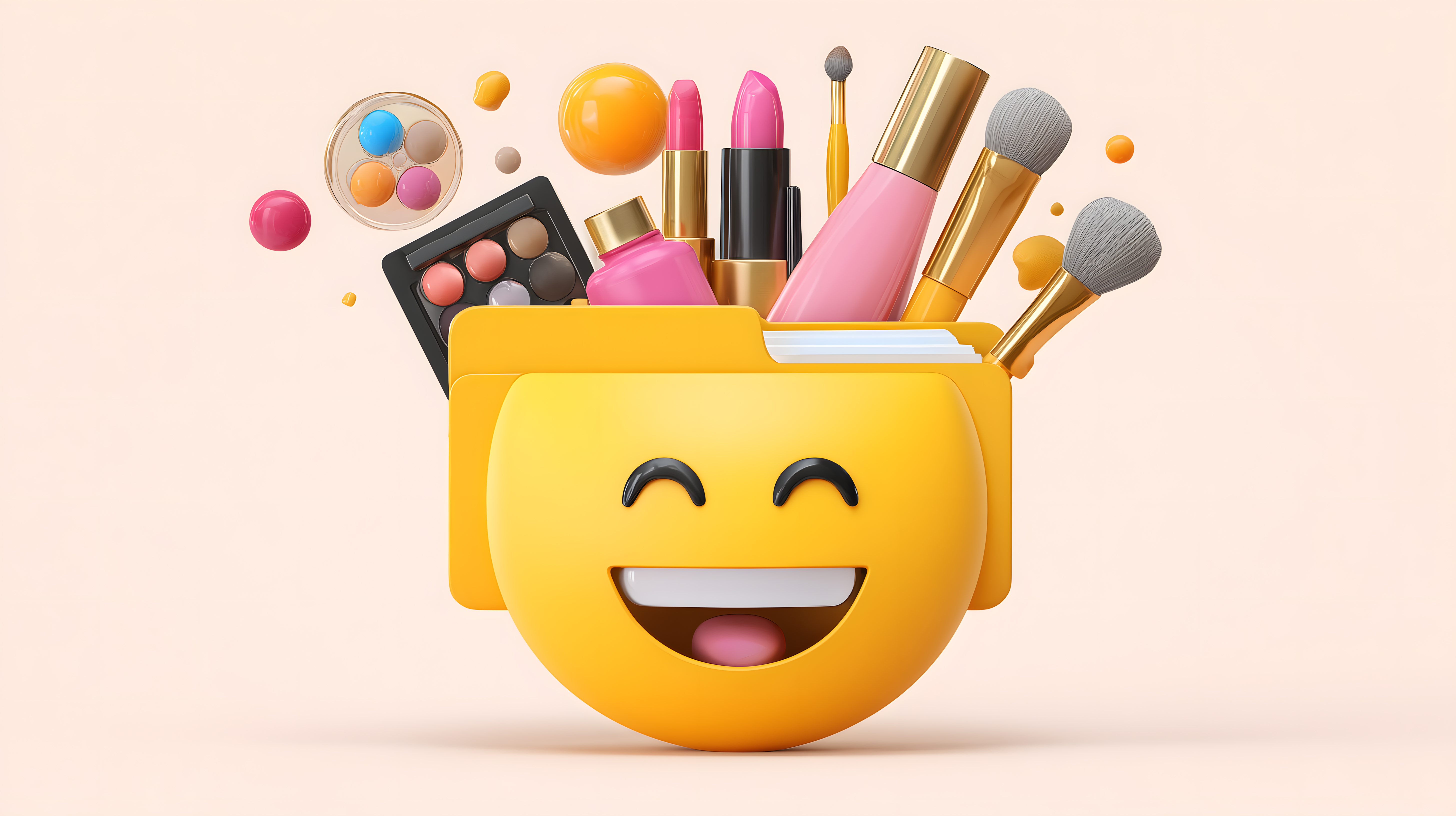 Das Bild zeigt eine bunte Zusammenstellung von Kosmetikprodukten wie Lidschatten, Lippenstifte, Puder und Pinsel, die in einem fröhlichen, lächelnden Emoji-Gesicht platziert sind. Die Darstellung ist in einer Draufsicht-Perspektive gehalten und präsentiert die Produkte in einer durchdachten, ästhetischen Anordnung. Die verwendete Farbpalette setzt sich aus verschiedenen Nuancen von Gelb, Pink, Grau und Braun zusammen, die ein harmonisches und einladendes Gesamtbild ergeben.