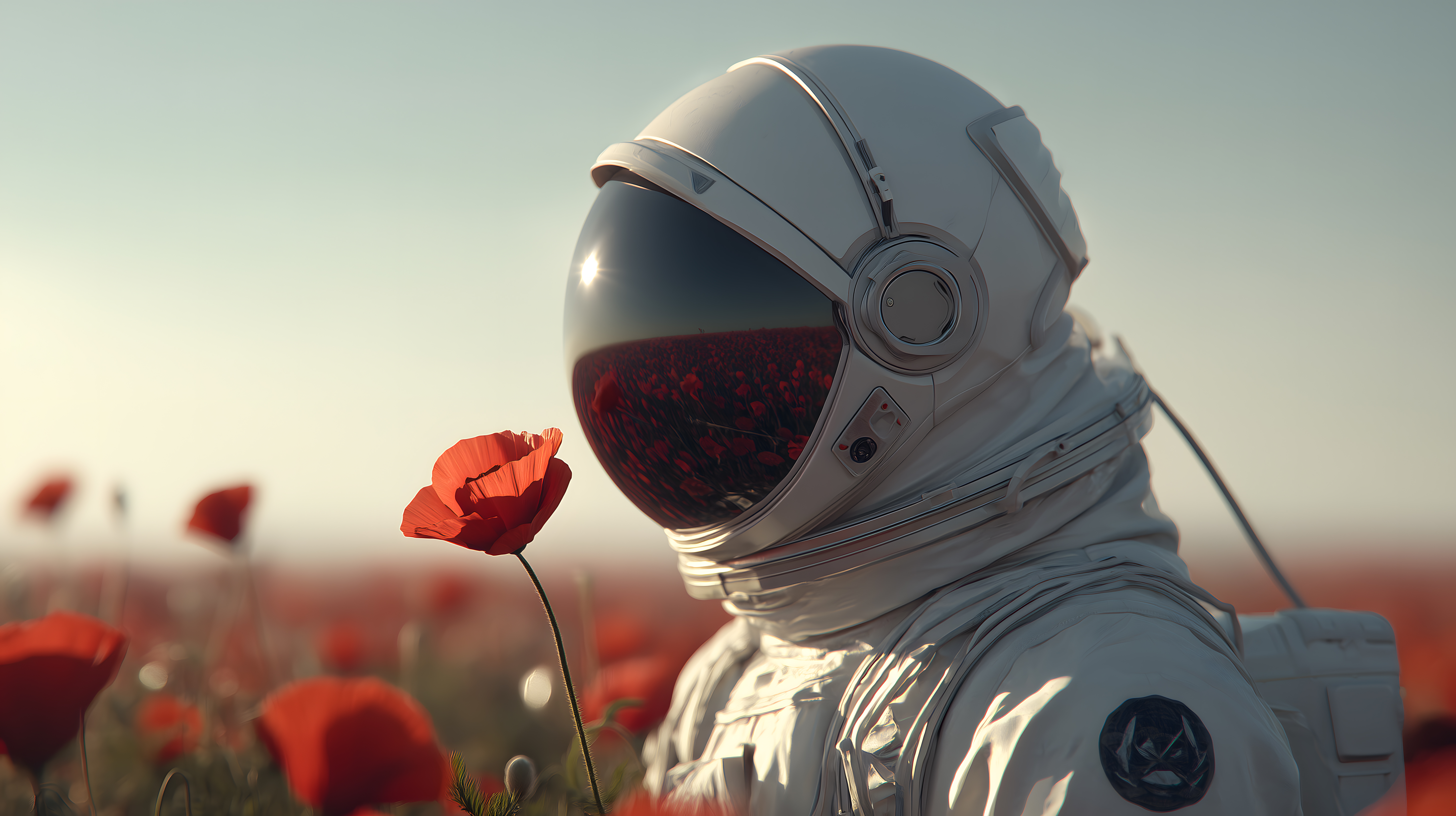 Das Bild zeigt einen Astronauten in einem Raumanzug, der eine rote Mohnblume in der Hand hält. Der Astronaut ist in einer Wüstenlandschaft mit roten Mohnblumen im Hintergrund zu sehen. Der Kontrast zwischen dem technischen Raumanzug und der natürlichen Blume schafft eine faszinierende Szene.