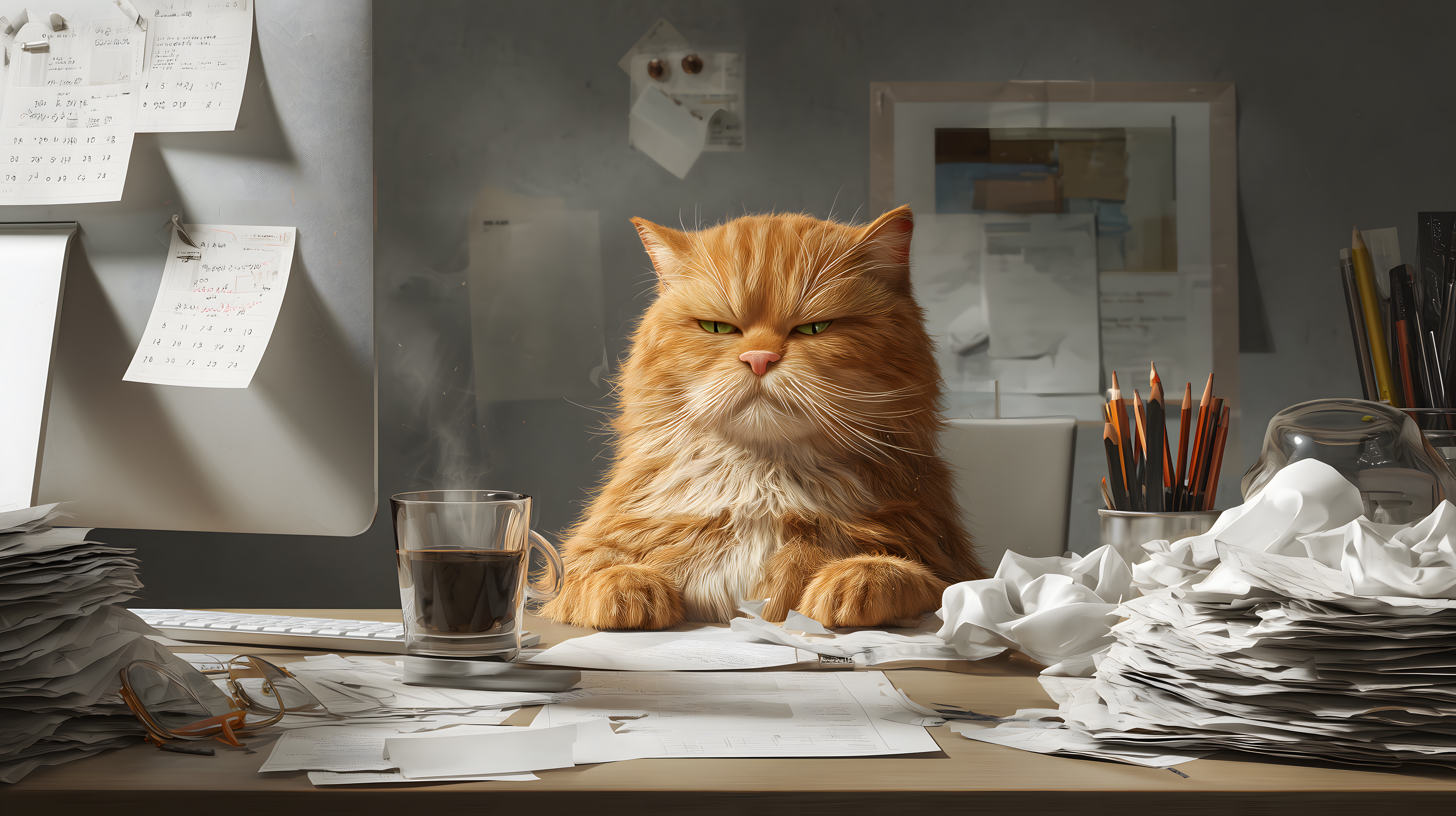 Das Foto zeigt eine Draufsicht auf einen Arbeitsplatz mit einem orange-weißen Kater, der inmitten von Papieren, Büromaterial und einer Tasse Kaffee sitzt. Die Stimmung ist ruhig und konzentriert, mit einem leicht unordentlichen, aber kreativen Ambiente. Die Farbpalette ist vorwiegend grau-weiß, mit Akzenten in Braun- und Orangetönen, die den Kater hervorheben.