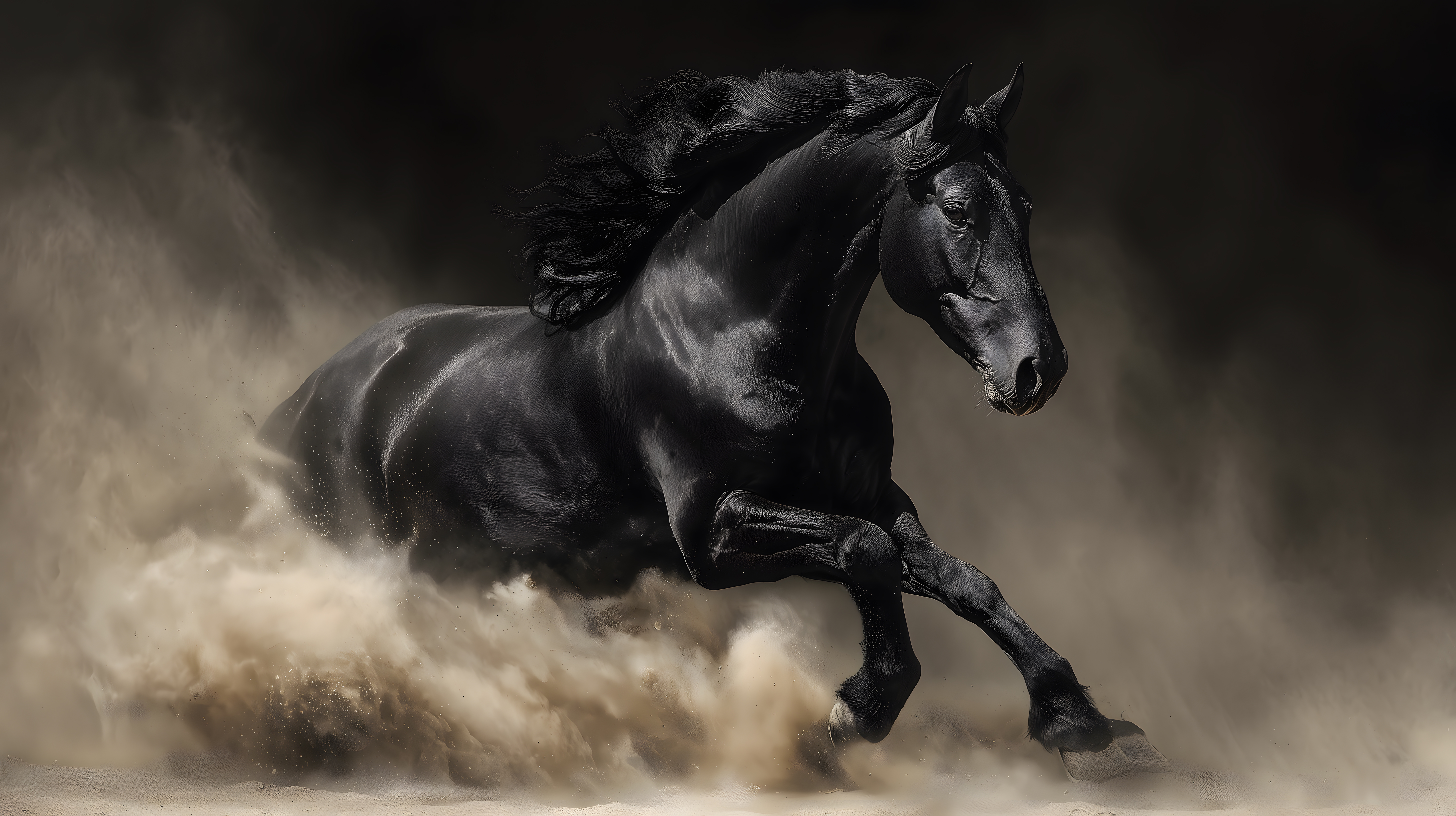 Das Bild zeigt ein majestätisches, schwarzes Pferd, das sich inmitten einer Staubwolke mit wehender Mähne und erhobenem Kopf bewegt. Die Aufnahme ist in schwarz-weiß gehalten, was dem Bild eine dramatische und kraftvolle Atmosphäre verleiht. Die Perspektive ist so gewählt, dass der Betrachter das Pferd aus einer leicht erhöhten Position betrachtet, wodurch die imposante Erscheinung des Tieres noch stärker betont wird.