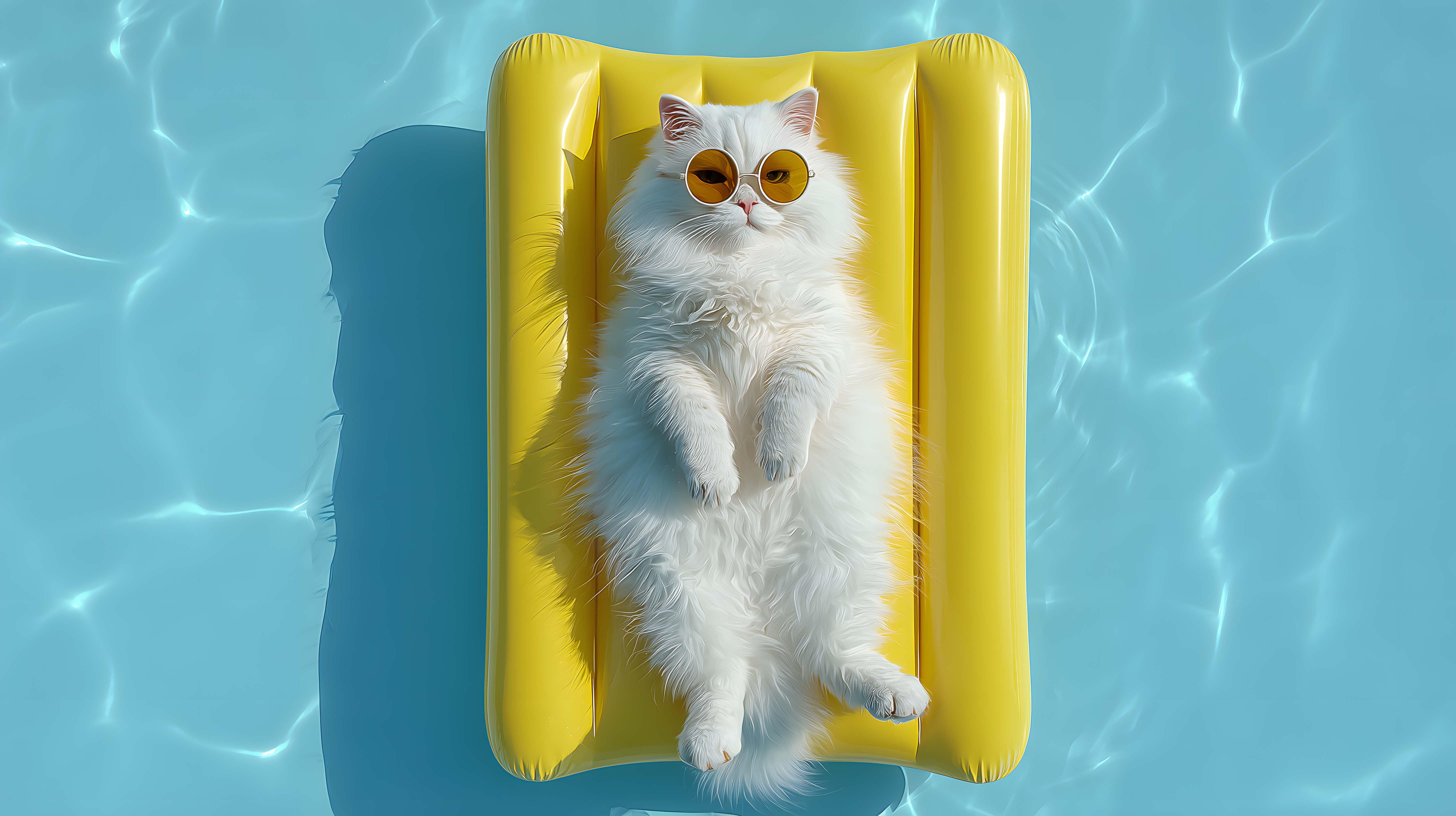 Das Bild zeigt eine weiße Perserkatze, die auf einem gelben, aufblasbaren Schwimmring sitzt und durch eine kreisförmige Sonnenbrille schaut. Der Hintergrund ist ein türkisfarbenes, kristallklares Wasser, das einen entspannten und sommerlichen Eindruck vermittelt.