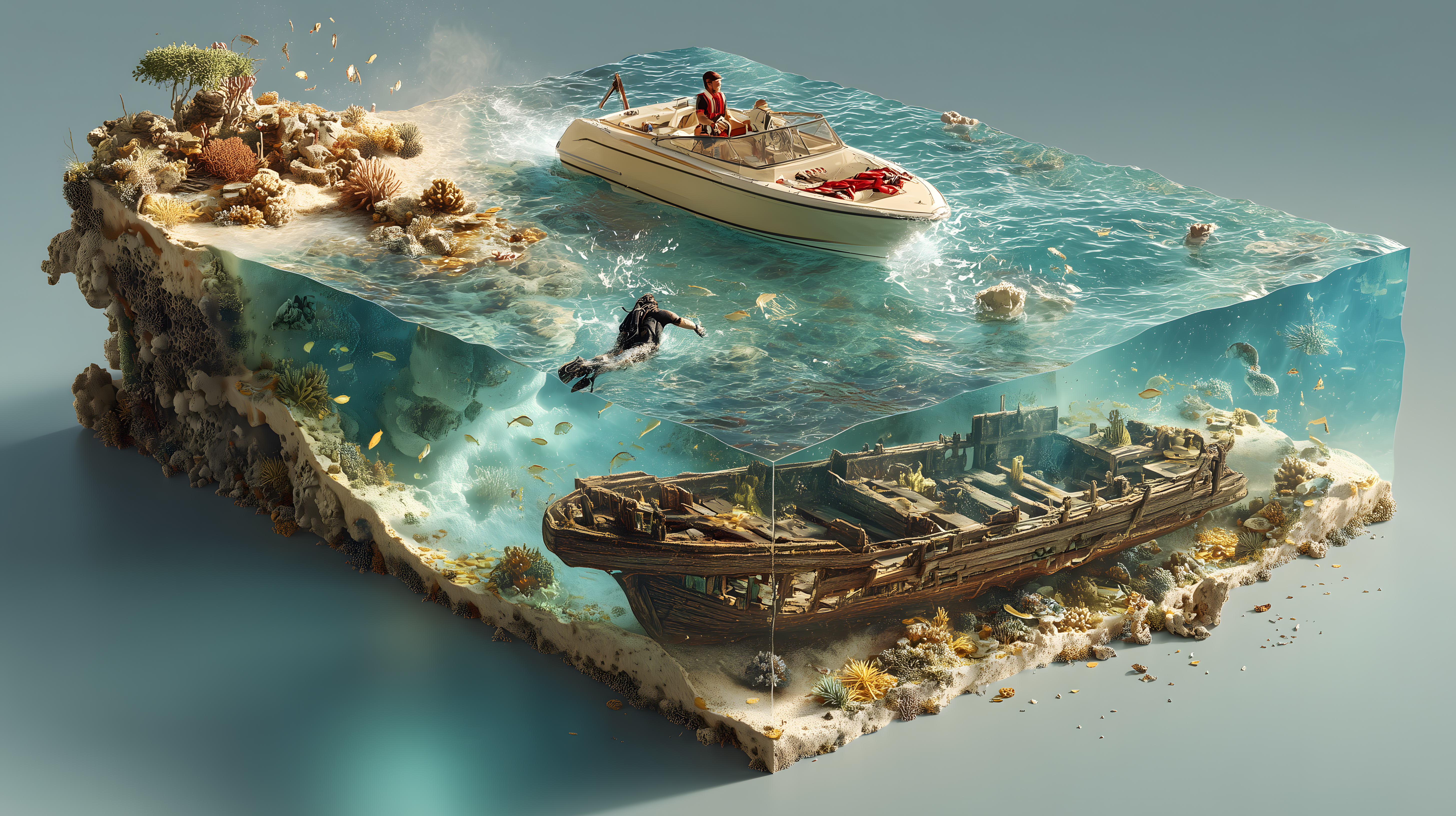 Das Bild zeigt eine surreale, aquatische Landschaft mit einer Kombination aus Unterwasserwelt und einer Bootsfahrt auf der Oberfläche. Im Vordergrund befindet sich ein Boot, das auf den Wellen des Meeres dahinfährt, während ein Taucher unter Wasser zu sehen ist. Im Hintergrund ist eine Insel oder Felsformation zu erkennen, die von Korallen und anderen Meereslebewesen bewachsen ist.