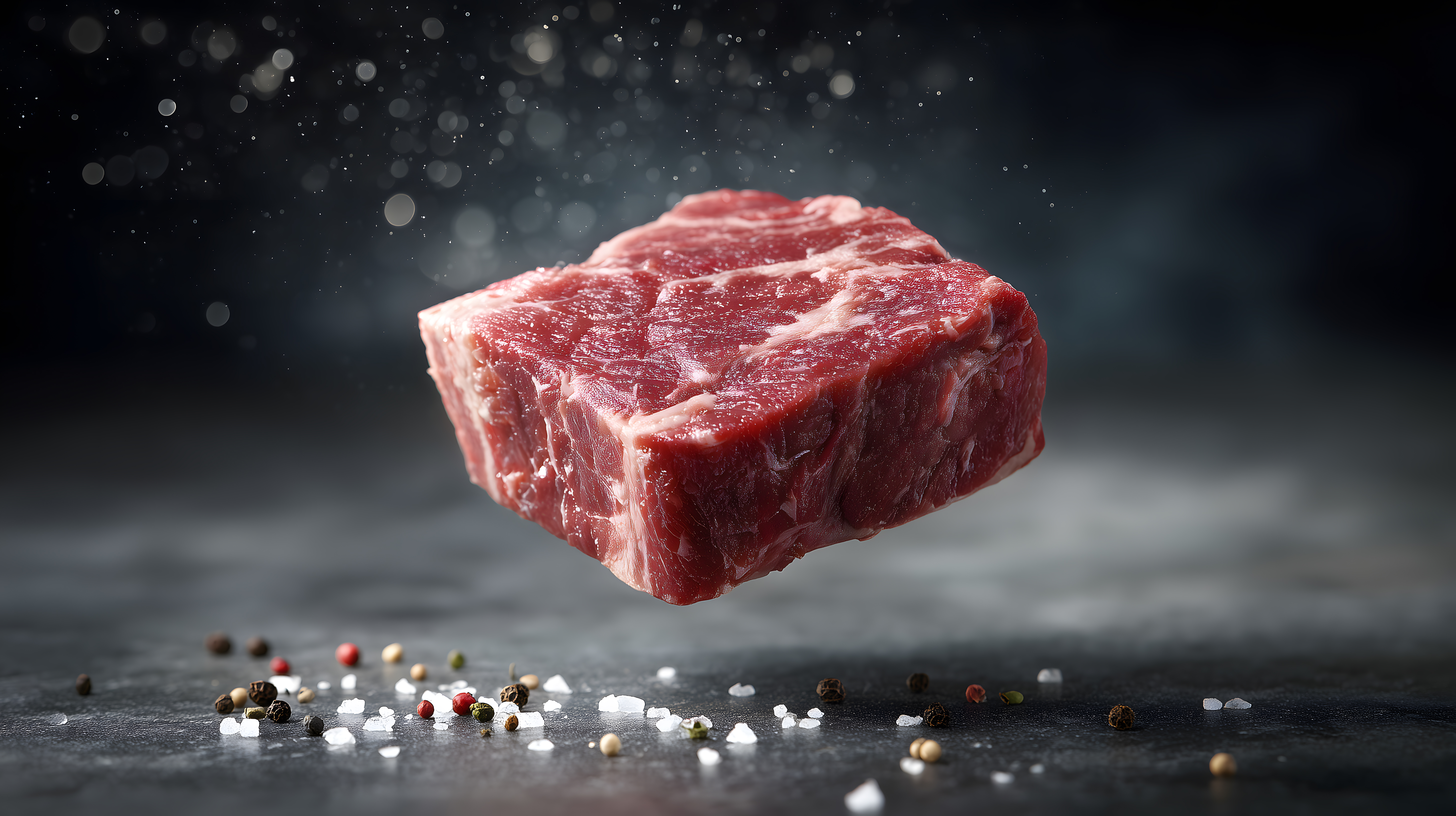Das Bild zeigt eine nahaufnahme eines würfelförmigen Fleischstücks, das vor einem dunklen Hintergrund mit Bokeh-Effekt präsentiert wird. Die kräftige rote Farbe des Fleisches, durchzogen von feinen Fettadern, lässt es als hochwertige Rinderqualität erscheinen. Im Vordergrund sind farbige Pfefferkörner und Salzkristalle zu sehen, die als dekorative Elemente dienen und auf die Würzung des Fleisches hinweisen.