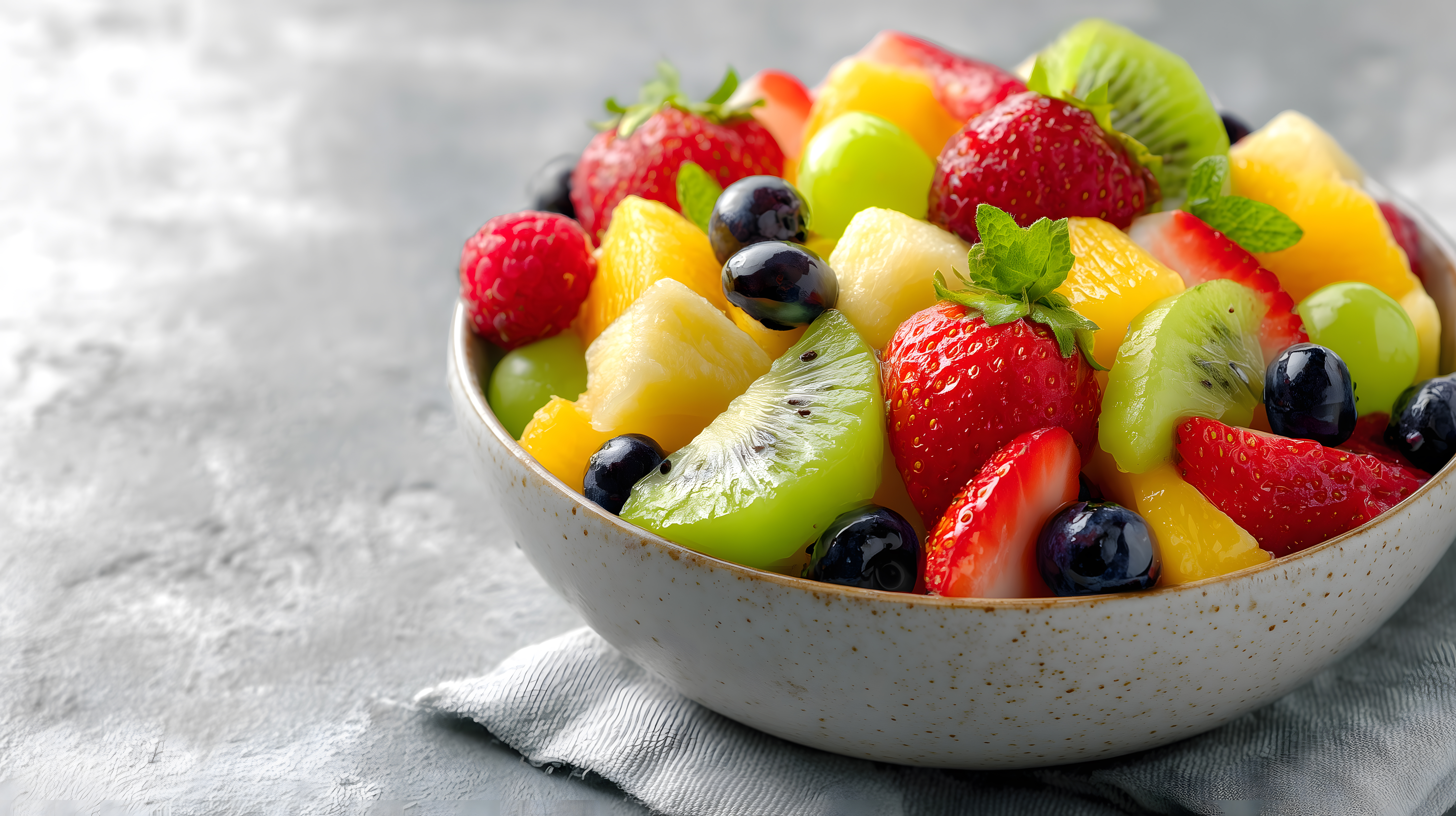 Das Bild zeigt eine Schüssel voller bunter Früchte. Im Vordergrund sind saftige rote Erdbeeren, gelbe Ananas-Scheiben, grüne Kiwi-Scheiben und violette Blaubeeren zu sehen. Im Hintergrund befinden sich weitere Früchte wie Trauben und Pfirsiche. Die Früchte sind kunstvoll in der Schüssel angeordnet, sodass ein appetitlicher Fruchtsalat entsteht. Das Bild ist in einer Draufsicht-Perspektive aufgenommen und verwendet eine farbenfrohe, frische Palette an Farben, die den Eindruck von Vitalität und Gesundheit vermitteln.