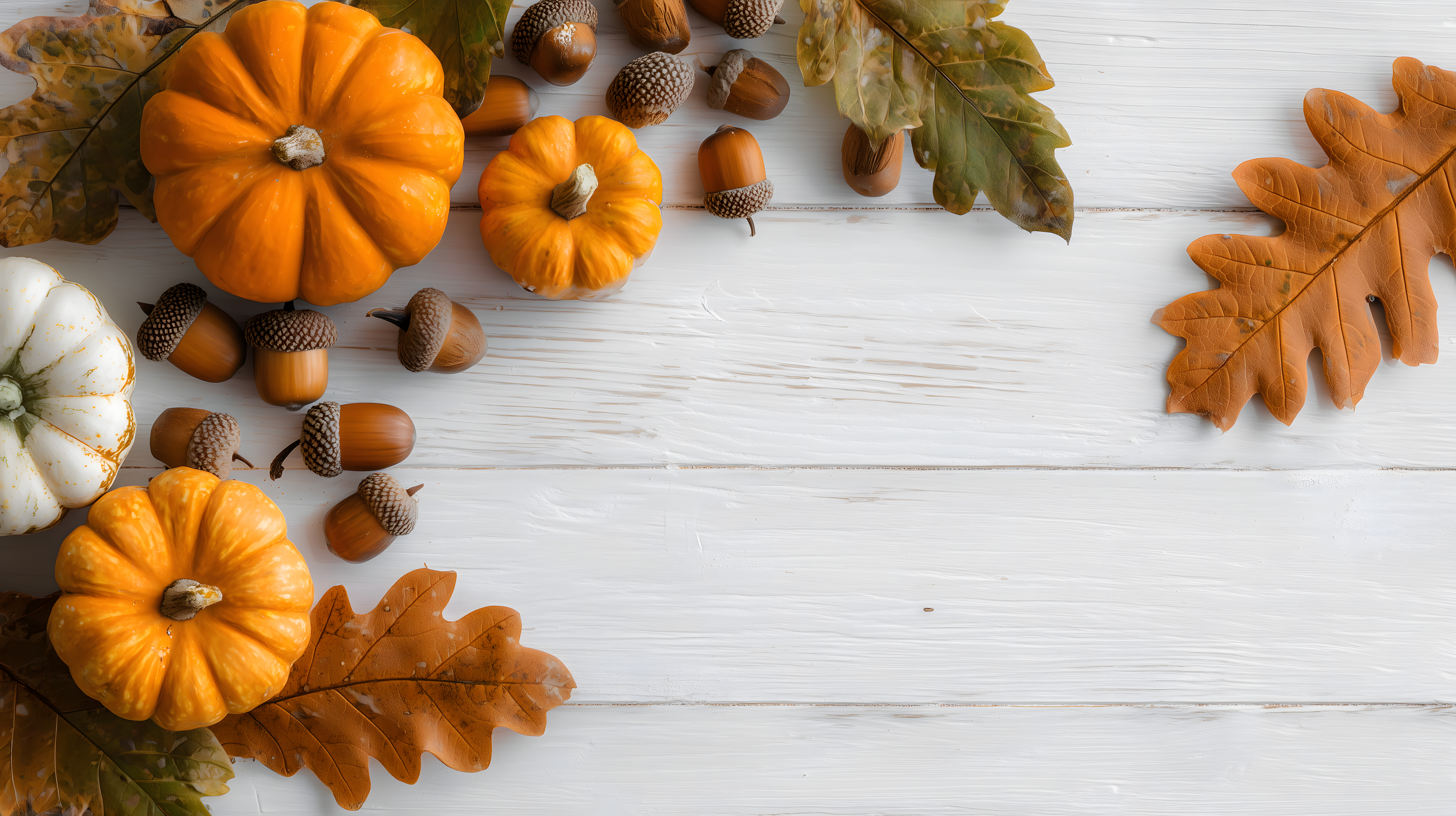 Das Bild zeigt eine Draufsicht auf eine Ansammlung von herbstlichen Deko-Elementen wie Kürbisse, Eicheln, Eichenblätter und Tannenäpfel auf einem weißen Holztisch. Die Farbpalette ist in warmen Gelb-, Orange- und Brauntönen gehalten, die eine gemütliche und herbstliche Stimmung vermitteln. Die Komposition ist sehr stimmungsvoll und symmetrisch angeordnet, wodurch der Fokus auf die dekorativen Elemente gelenkt wird.