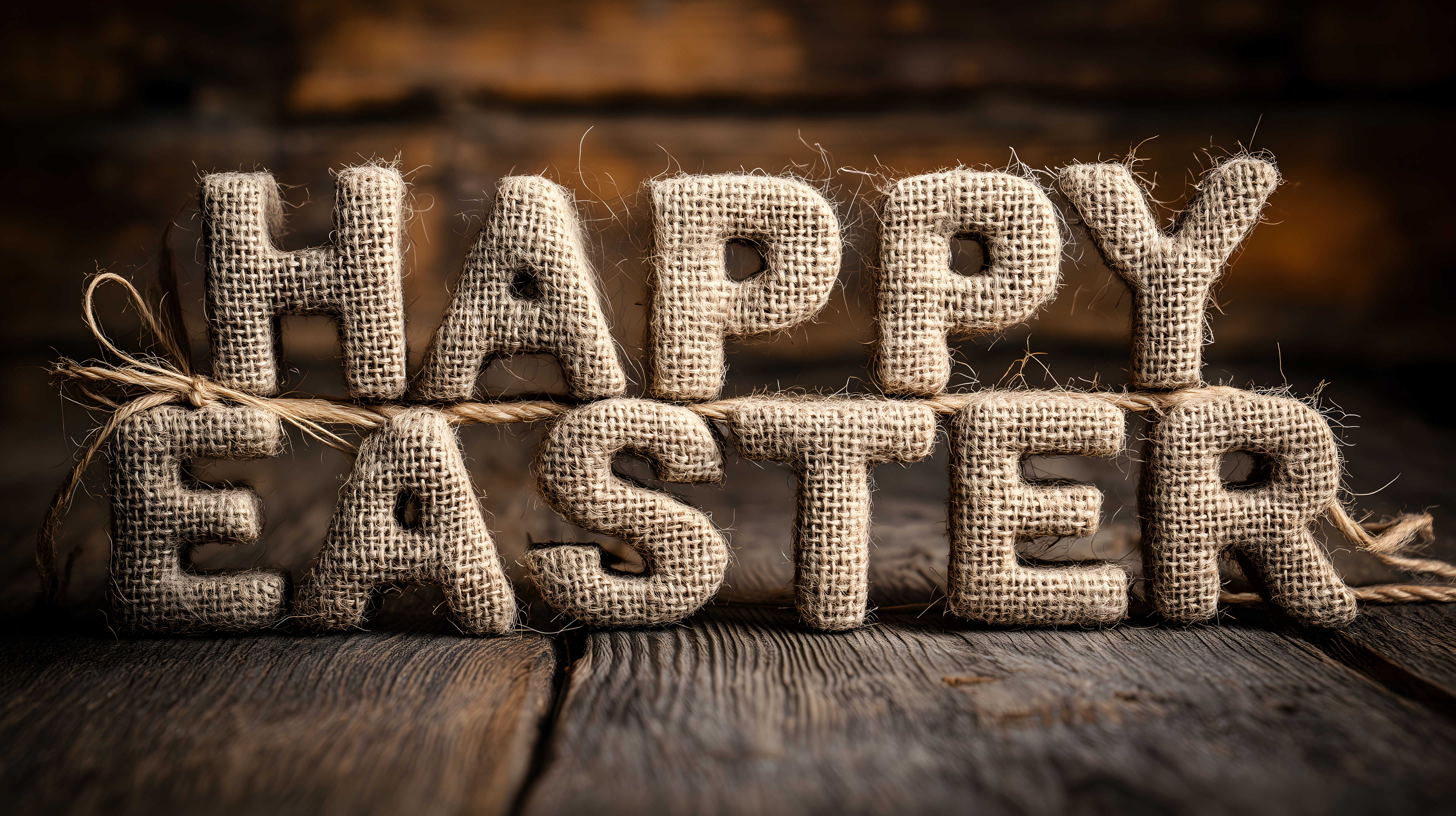Das Bild zeigt den Schriftzug "Happy Easter" in Großbuchstaben, der aus grobem, grauem Jutestoff gefertigt ist. Die Buchstaben sind vor einem dunklen Hintergrund platziert, was einen starken Kontrast erzeugt und die Optik hervorhebt. Die Komposition ist symmetrisch und zentriert, was dem Betrachter eine klare, visuelle Botschaft vermittelt.