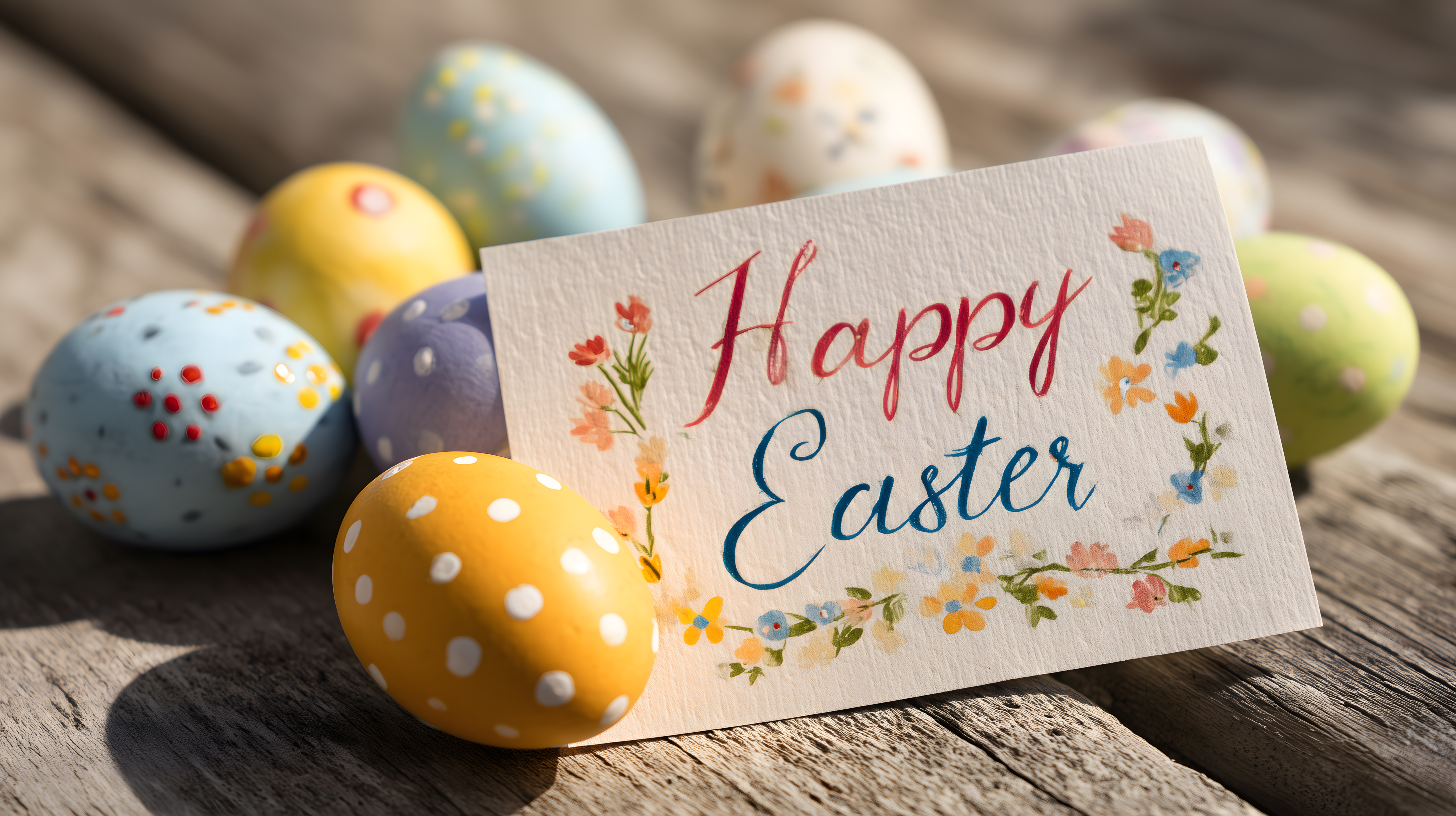 Das Bild zeigt eine Nahaufnahme von mehreren bunt bemalten Ostereiern auf einem Holztisch. In der Mitte befindet sich eine Grußkarte mit der Aufschrift "Happy Easter" und einer floralen Umrandung. Die Eier weisen verschiedene Farben und Muster wie Punkte, Streifen und Blumen auf, was eine lebendige und fröhliche Stimmung vermittelt.