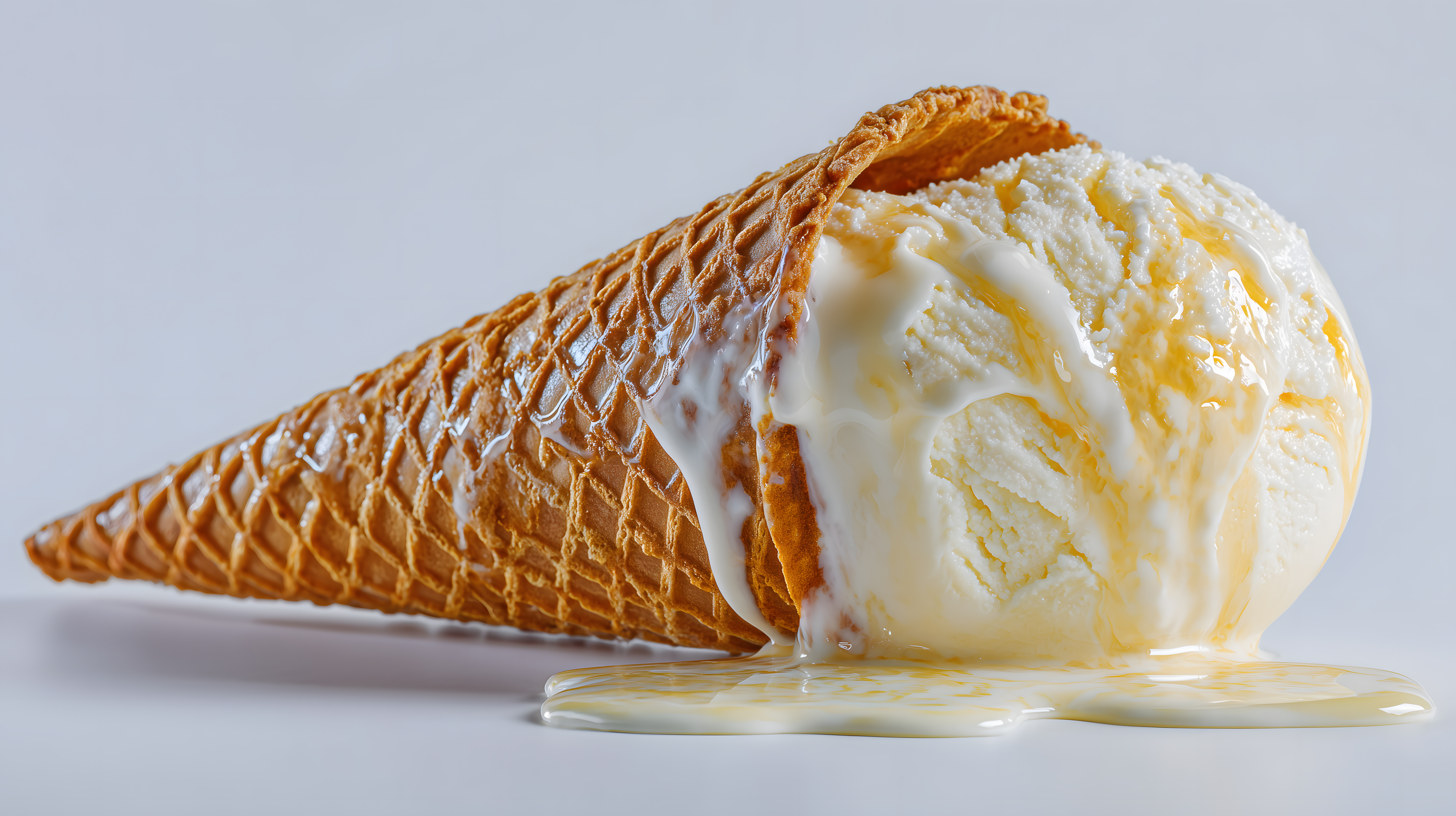 Das Bild zeigt eine nahaufnahme eines Eiscremekegels mit weißer Vanilleglasur. Der Kegel ist mit einer goldbraunen, knusprigen Waffel umgeben, die einen starken Kontrast zur cremigen Oberfläche des Eises bildet. Die Perspektive des Fotos ist leicht schräg, wodurch der Fokus auf das Eis und seine Textur gelegt wird. Die Farbpalette ist vorwiegend in Gelb- und Weißtönen gehalten, was eine frische und einladende Atmosphäre erzeugt.