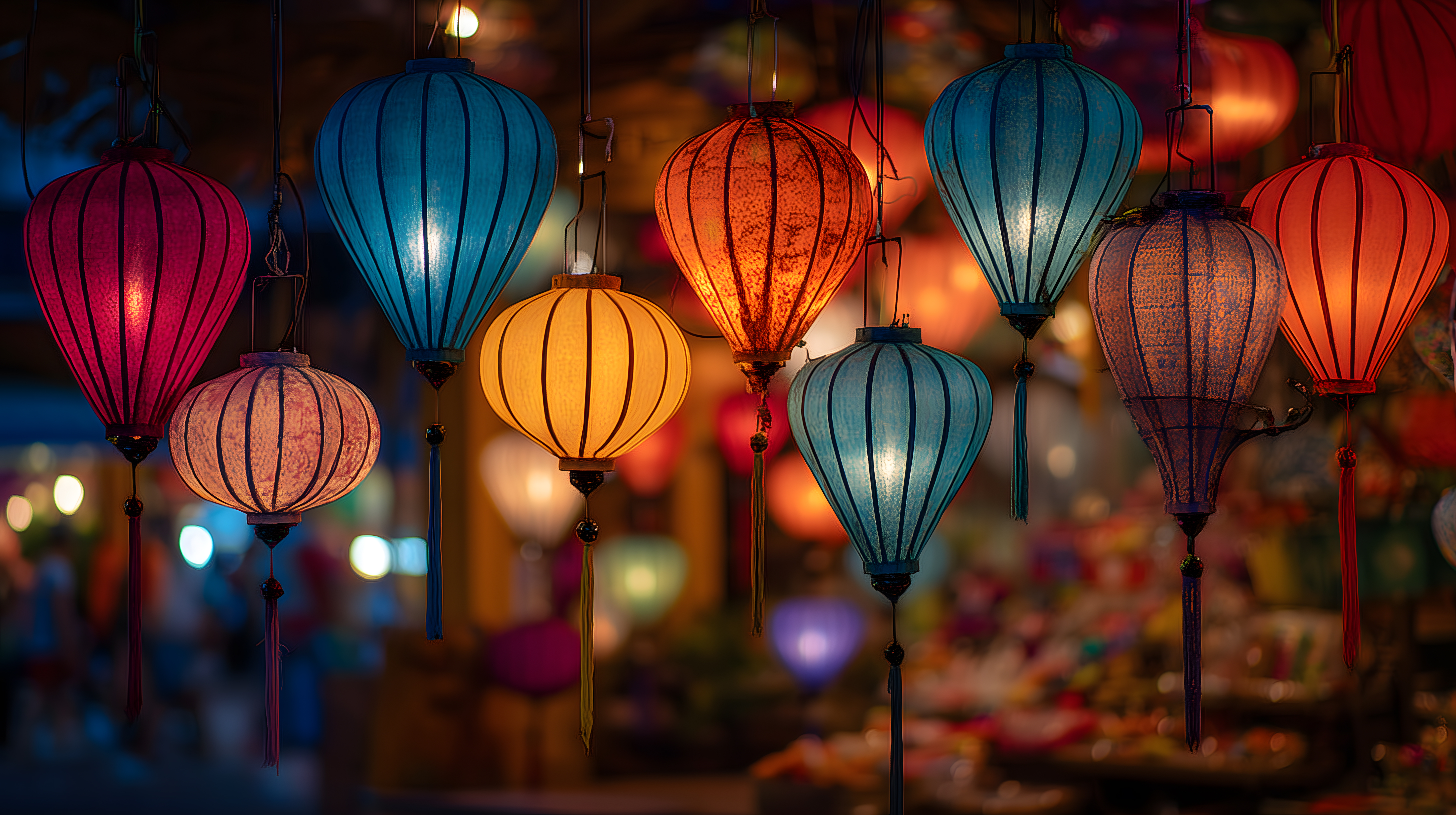 Das Foto zeigt eine Vielzahl bunter, asiatischer Laternenkörbe, die an Seilen hängend in der Dämmerung zu sehen sind. Die Laternenkörbe sind in verschiedenen Formen und Farbtönen, wie Rot, Orange, Gelb und Blau, gehalten und erzeugen eine stimmungsvolle, warme Atmosphäre. Die Komposition ist symmetrisch und die Perspektive lässt den Betrachter in die Szenerie eintauchen.