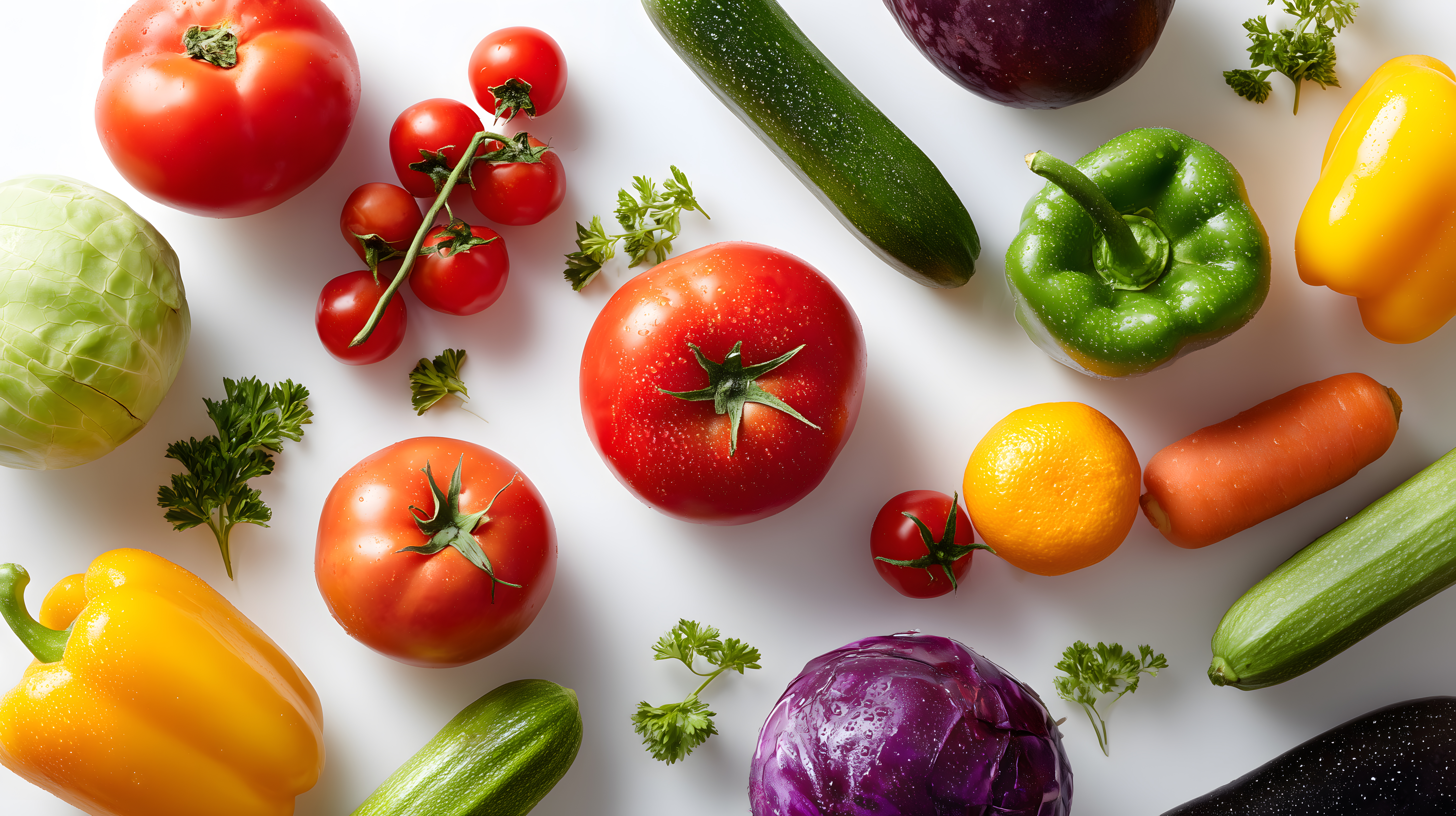 Das Bild zeigt eine Zusammenstellung verschiedener frischer Gemüse und Obststücke auf einer weißen Oberfläche. Zu sehen sind Tomaten, Gurken, Paprika, Karotten, Orangen und weitere Produkte, die in einer attraktiven Draufsicht-Komposition angeordnet sind. Die Farbpalette ist lebhaft und reicht von Rot über Grün bis Gelb, was eine einladende Optik erzeugt.