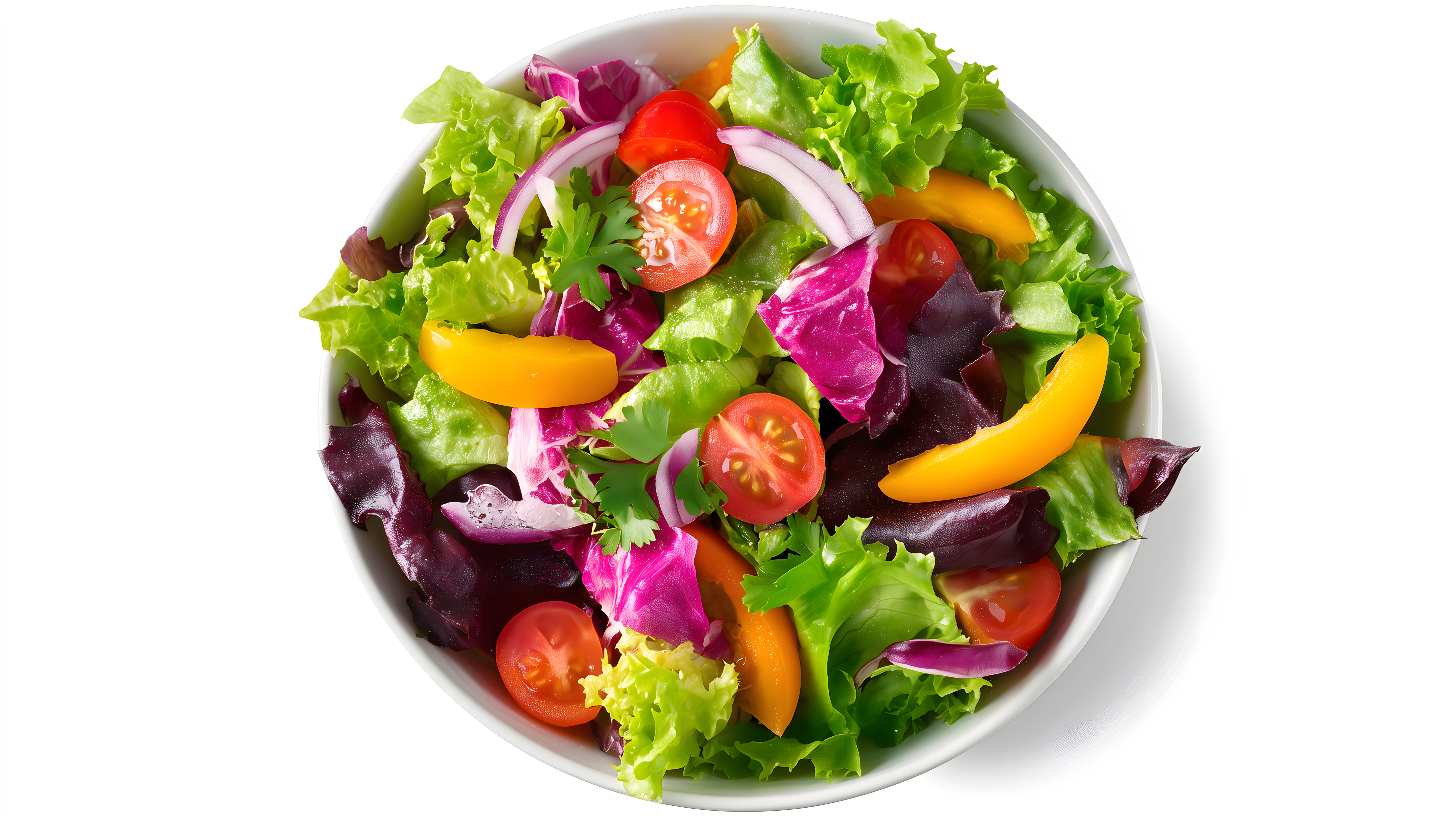 Das Bild zeigt eine Schüssel mit einer bunten Auswahl an frischen Salatzutaten. Die Schüssel ist in einer Draufsicht-Perspektive fotografiert, was einen detaillierten Blick auf die Zutaten ermöglicht. Die Farbpalette reicht von Grün über Rot, Gelb und Violett, was dem Bild eine lebendige und appetitliche Ausstrahlung verleiht.