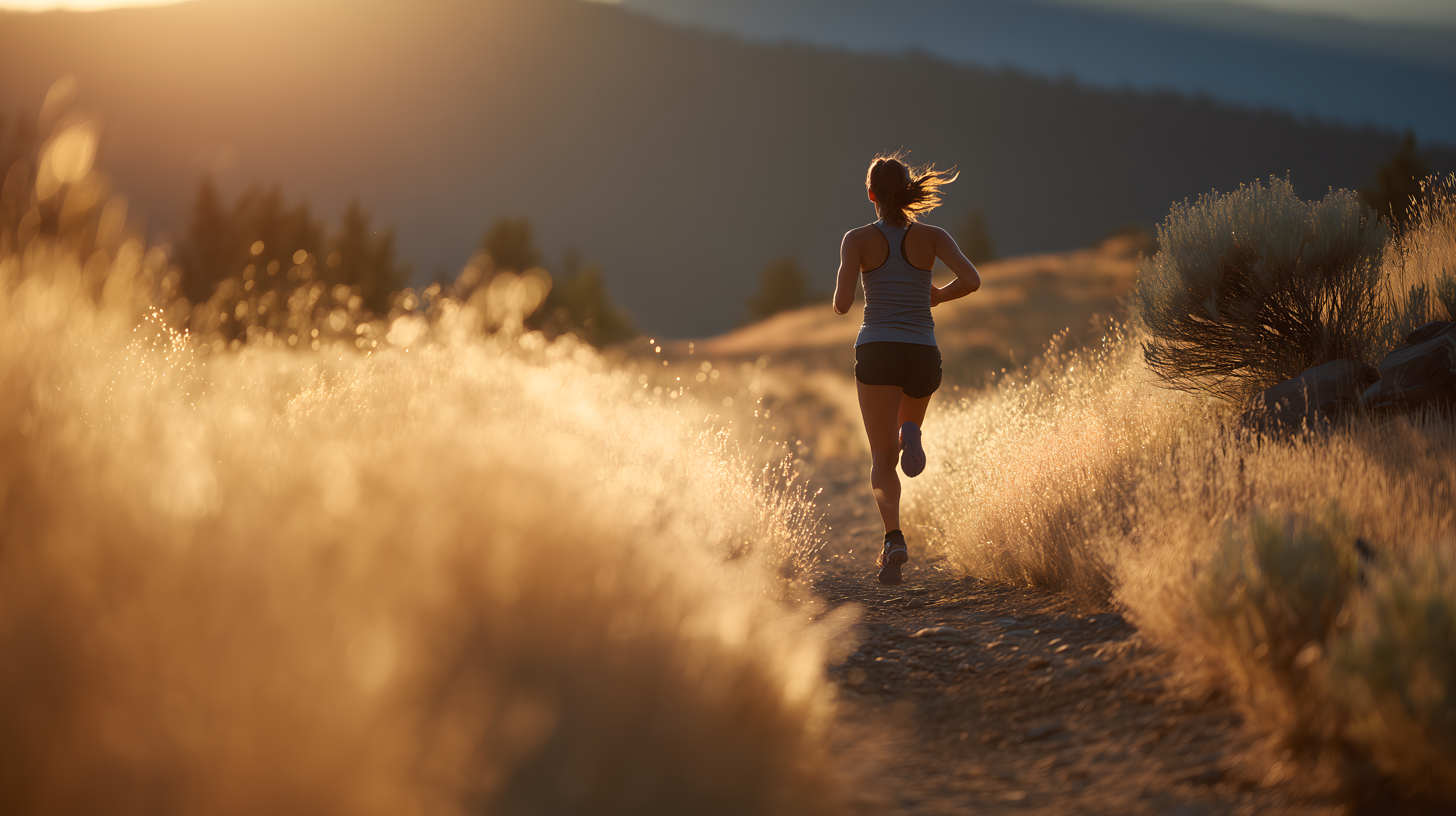 Das Bild zeigt eine Läuferin, die in einer malerischen Landschaft läuft. Die Sonne geht gerade unter und taucht die Szene in ein warmes, goldenes Licht. Der Weg schlängelt sich durch das hohe Gras, während im Hintergrund Hügel und Bergspitzen zu sehen sind. Die Läuferin ist in Bewegung erfasst, ihre Haare wehen im Wind.