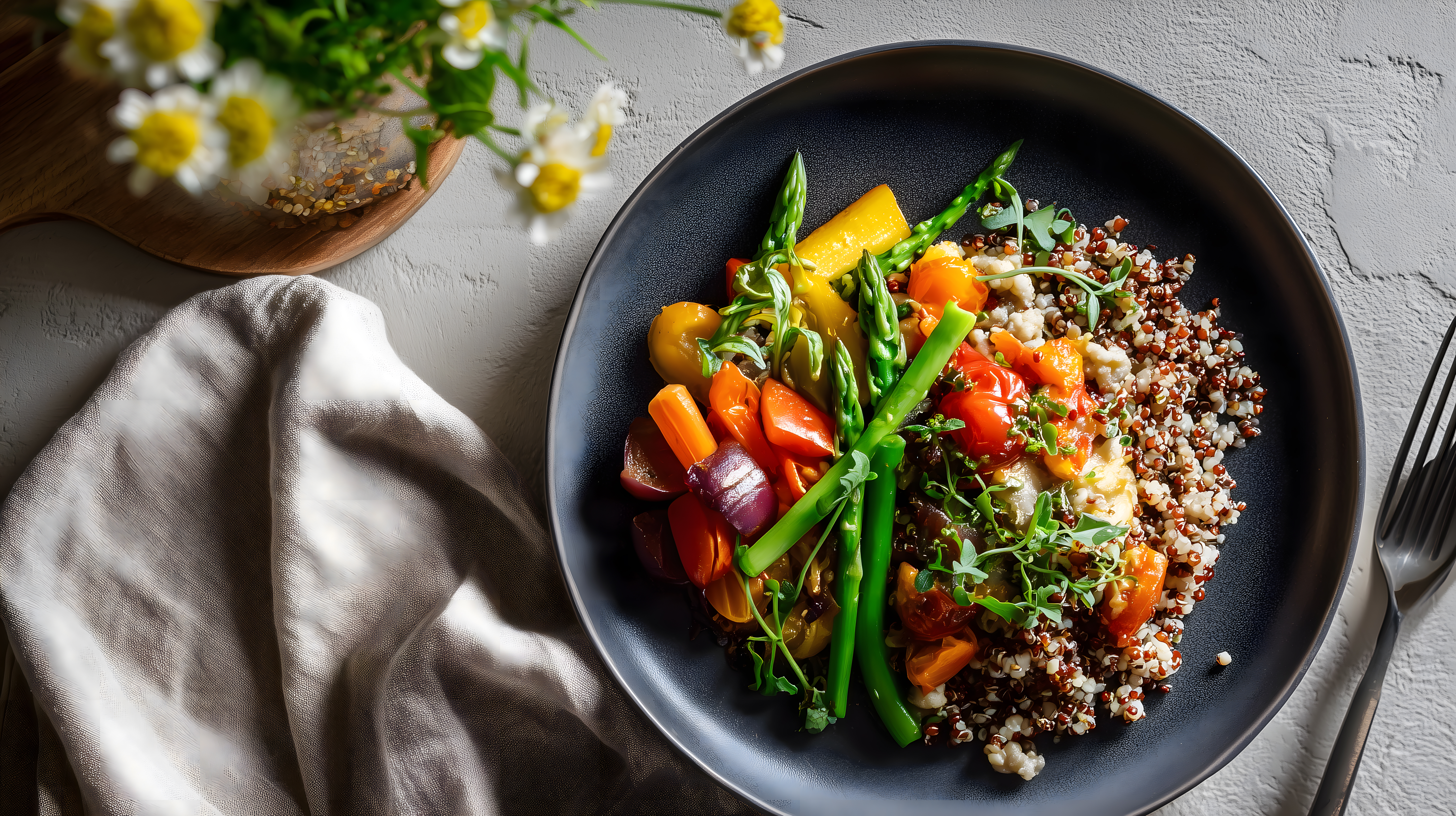 Das Bild zeigt eine Draufsicht auf einen geschmackvoll angerichteten Teller mit einer gesunden und nahrhaften Mahlzeit. Im Vordergrund befindet sich ein schwarzer Teller, der mit einer Mischung aus Quinoa, gebratenen Gemüsestücken wie Karotten, Paprika und Zwiebeln sowie grünen Spargel angerichtet ist. Die Kombination der Zutaten und Farben erzeugt ein appetitliches und ausgewogenes Gesamtbild. Im Hintergrund sind einige Gänseblümchen zu sehen, die dem Arrangement einen natürlichen und frischen Akzent verleihen.