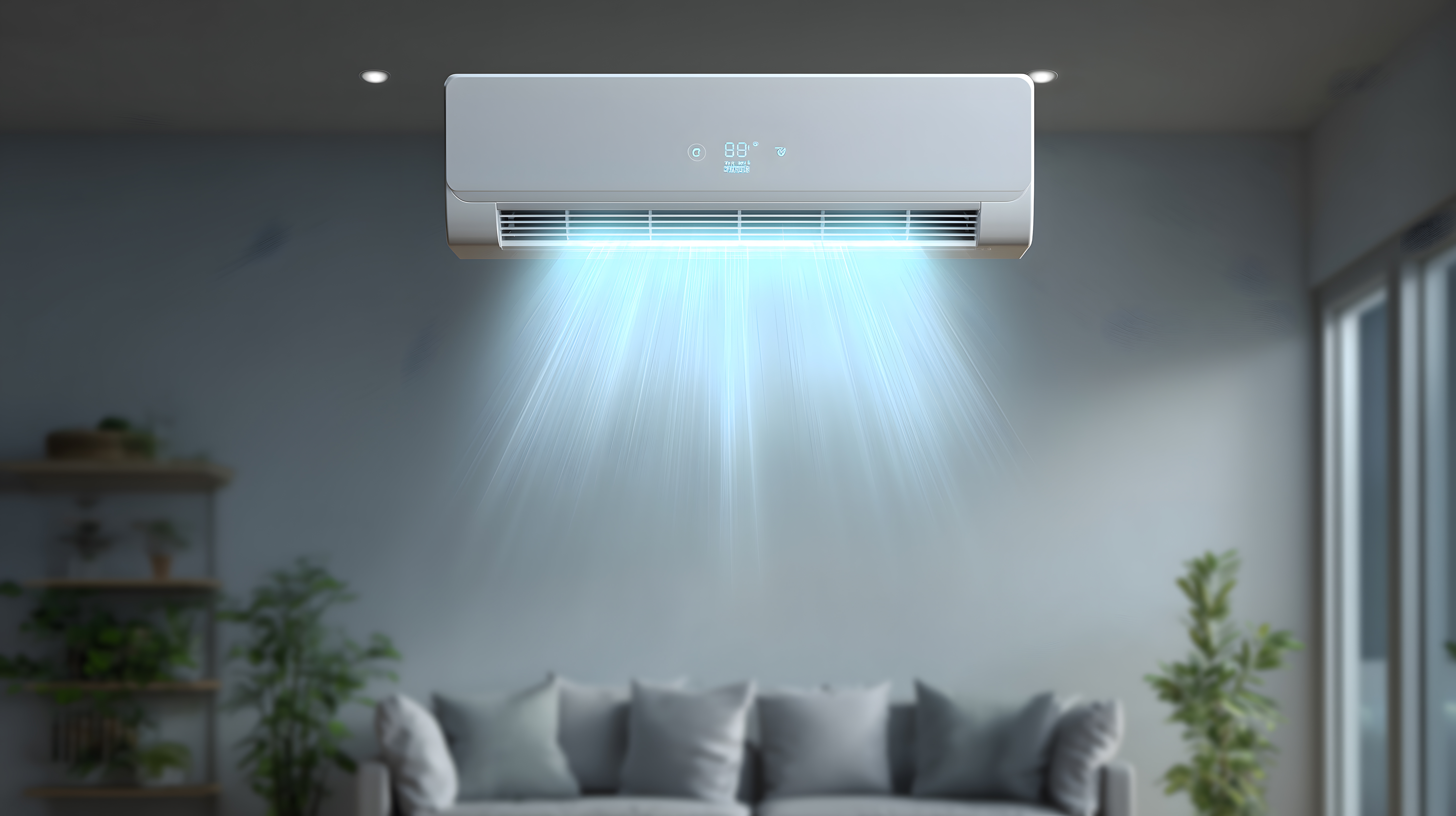 Das Bild zeigt einen modernen, weißen Klimaanlagenauslauf, der Luft in einen Wohnraum bläst. Der Hintergrund ist dunkel gehalten, um die Technik in den Fokus zu rücken. Die Lüftungsschlitze strahlen ein kühles, helles Licht aus, das den Raum erhellt. Die Farbpalette ist auf Grau- und Weißtöne beschränkt, was eine minimalistisch-elegante Atmosphäre schafft.