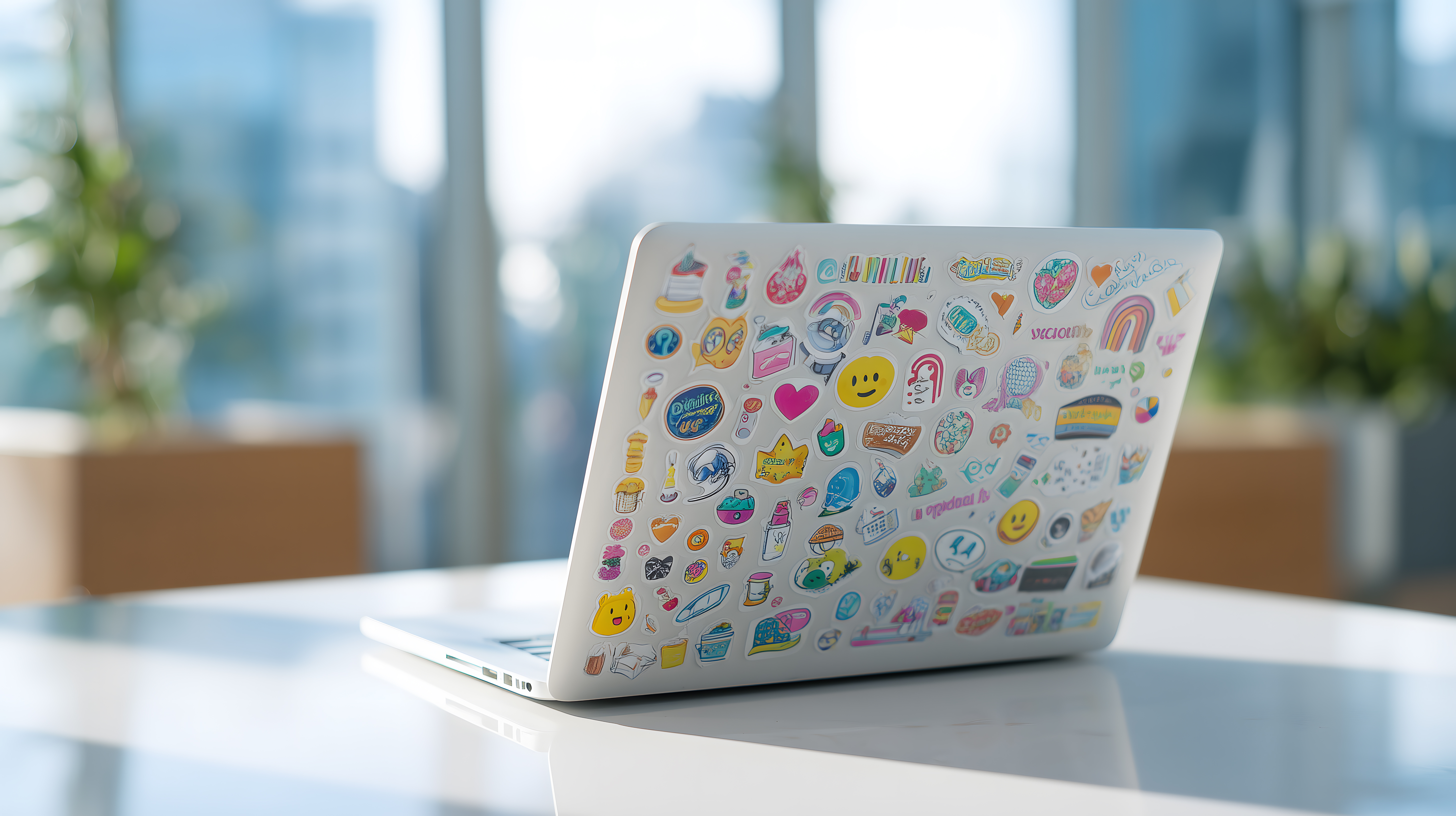 Das Bild zeigt einen laptop mit einer Vielzahl von bunten und fröhlichen Aufklebern und Symbolen darauf. Der Laptop befindet sich auf einem hellen Holztisch, vor einem unscharfen Hintergrund mit Bäumen und Pflanzen. Die Perspektive ist eine Draufsicht, die den Laptop in den Mittelpunkt rückt. Die Farbpalette ist lebendig und vielfältig, mit Gelb-, Blau- und Rosatönen, die eine fröhliche und kreative Stimmung vermitteln.