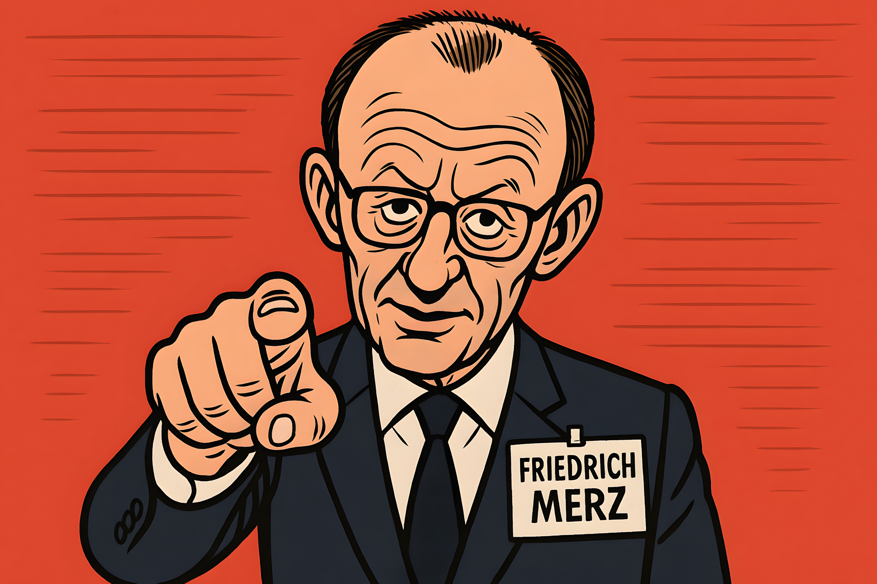 Das Bild zeigt eine Karikatur eines Mannes mit Brille und Anzug, der in die Kamera blickt und dabei eine Name-Tag mit der Aufschrift "Friedrich Merz" trägt. Der Hintergrund ist in einem kräftigen Rot gehalten, was dem Bild eine starke visuelle Wirkung verleiht.