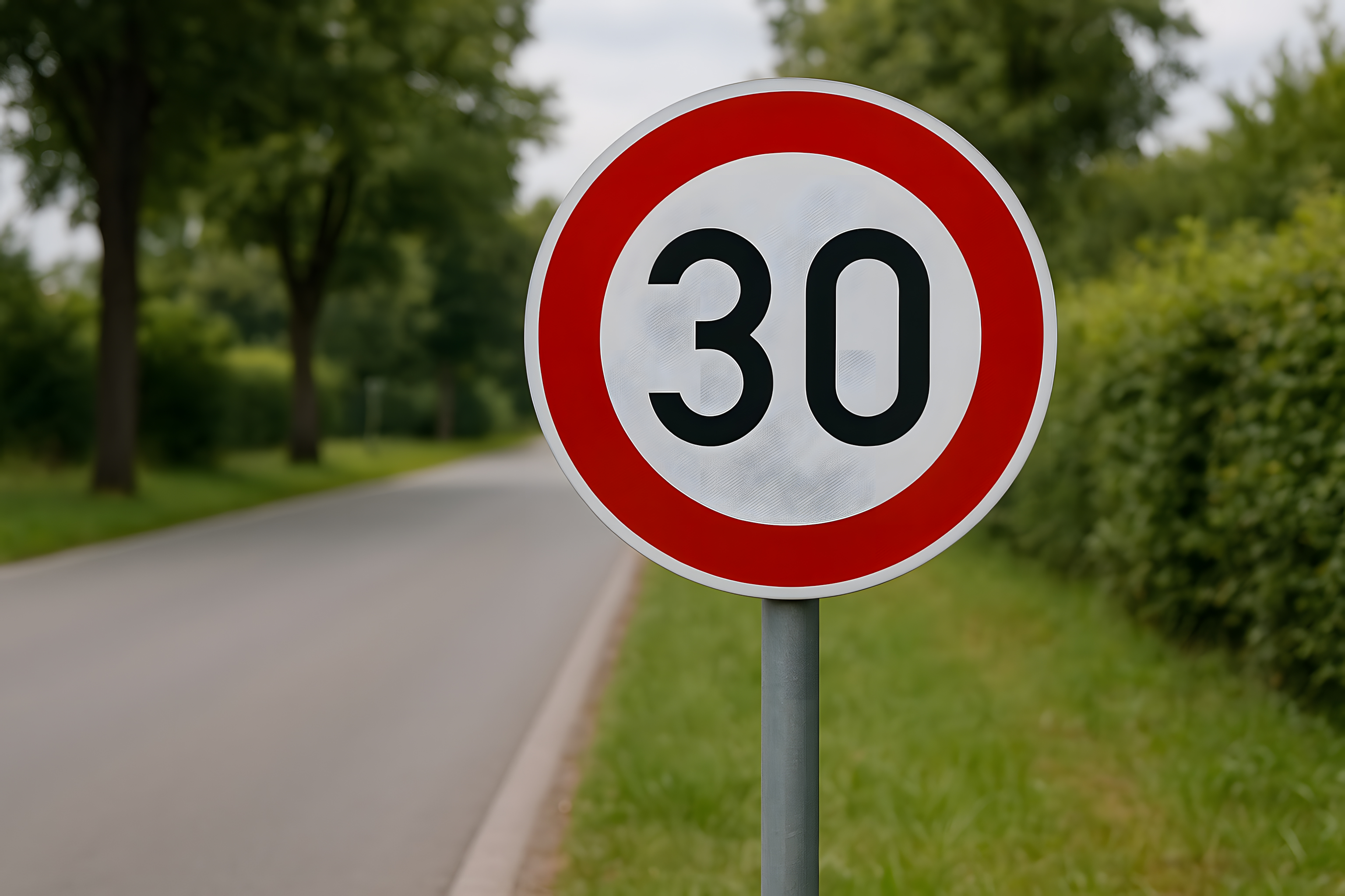 Das Bild zeigt ein rot-weißes Verkehrsschild, das eine Höchstgeschwindigkeit von 30 km/h anzeigt. Das Schild ist in einem Waldgebiet aufgestellt, umgeben von grünen Bäumen und einer asphaltierten Straße. Die Perspektive ist leicht schräg, wodurch das Schild im Vordergrund liegt und die Umgebung unscharf im Hintergrund erscheint.