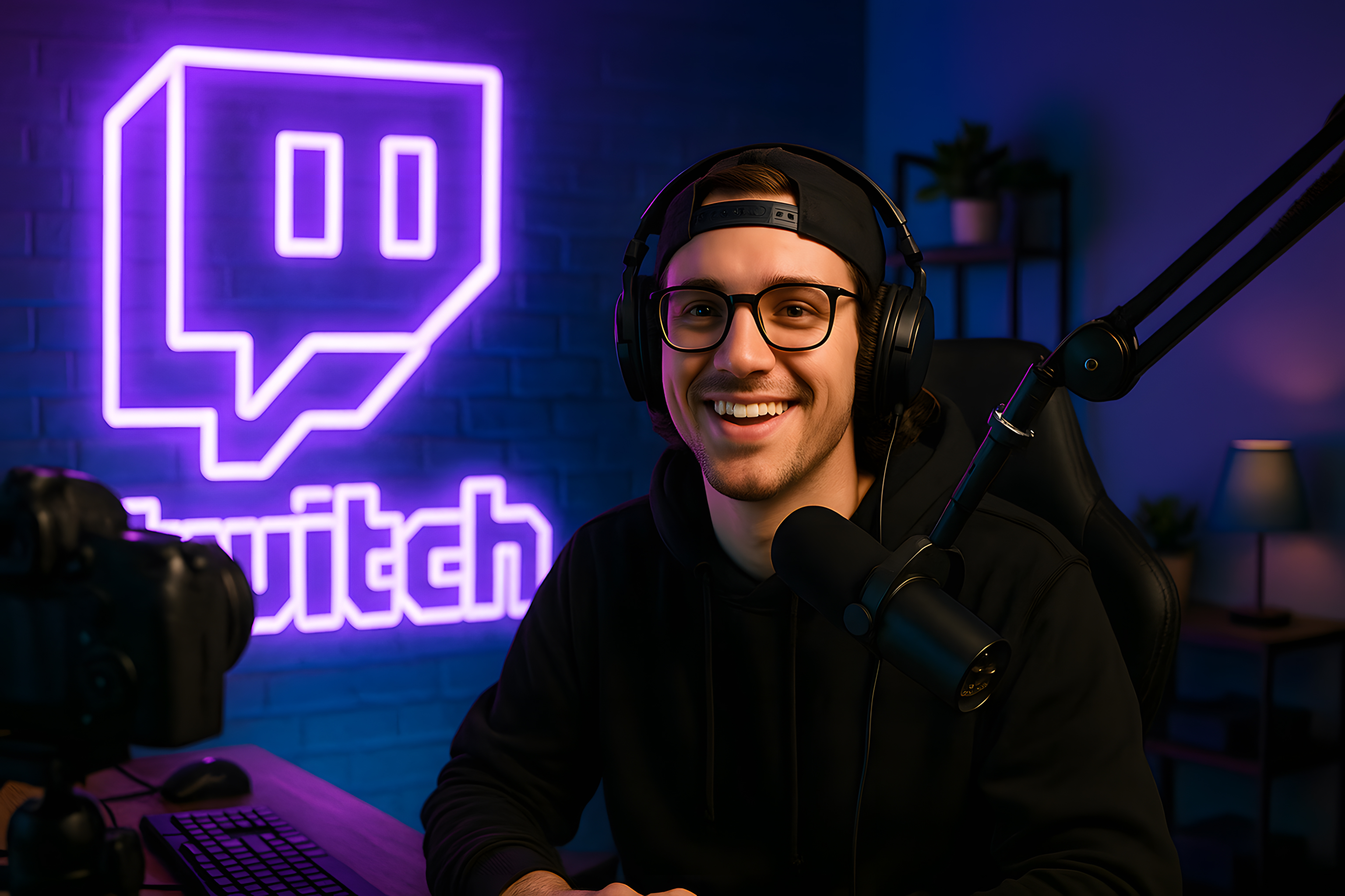 Das Bild zeigt einen jungen Mann, der vor einem leuchtenden Twitch-Logo sitzt und ein Headset trägt. Er lächelt in die Kamera und scheint in einer Streaming-Umgebung zu sein. Die Beleuchtung ist dunkel, mit einem blauen und lila Farbschema, was eine stimmungsvolle Atmosphäre schafft.