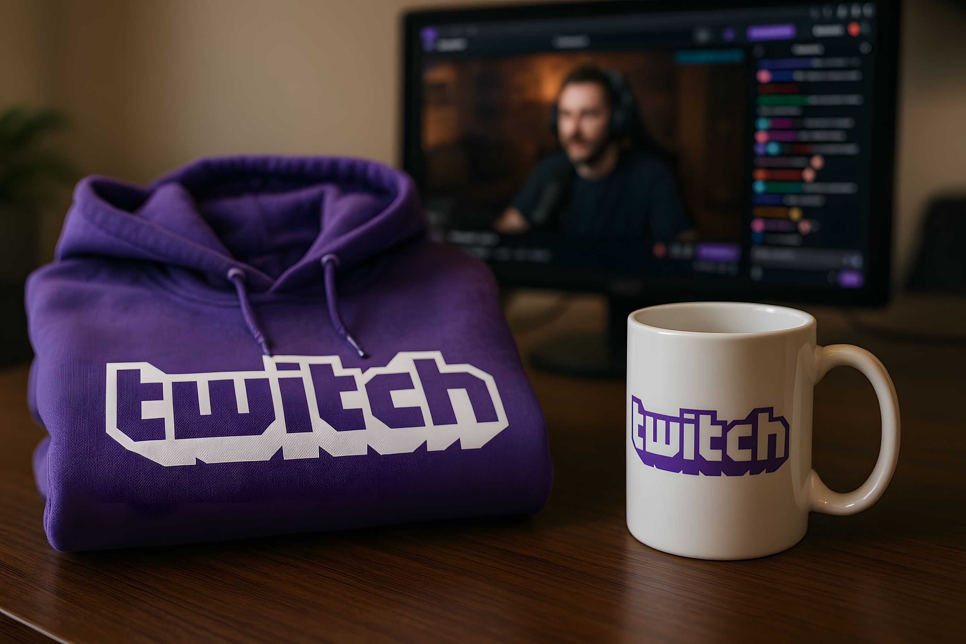 Das Bild zeigt einen Laptop-Bildschirm, der eine Person in einem Hoodie mit dem Twitch-Logo zeigt. Vor dem Bildschirm sind ein violetter Twitch-Hoodie und eine weiße Twitch-Tasse platziert. Die Perspektive ist eine Draufsicht auf den Arbeitsplatz, wodurch die verschiedenen Elemente gut sichtbar sind. Die Farbpalette ist hauptsächlich in Violett- und Grautönen gehalten, was den Twitch-Markencharakter unterstreicht.