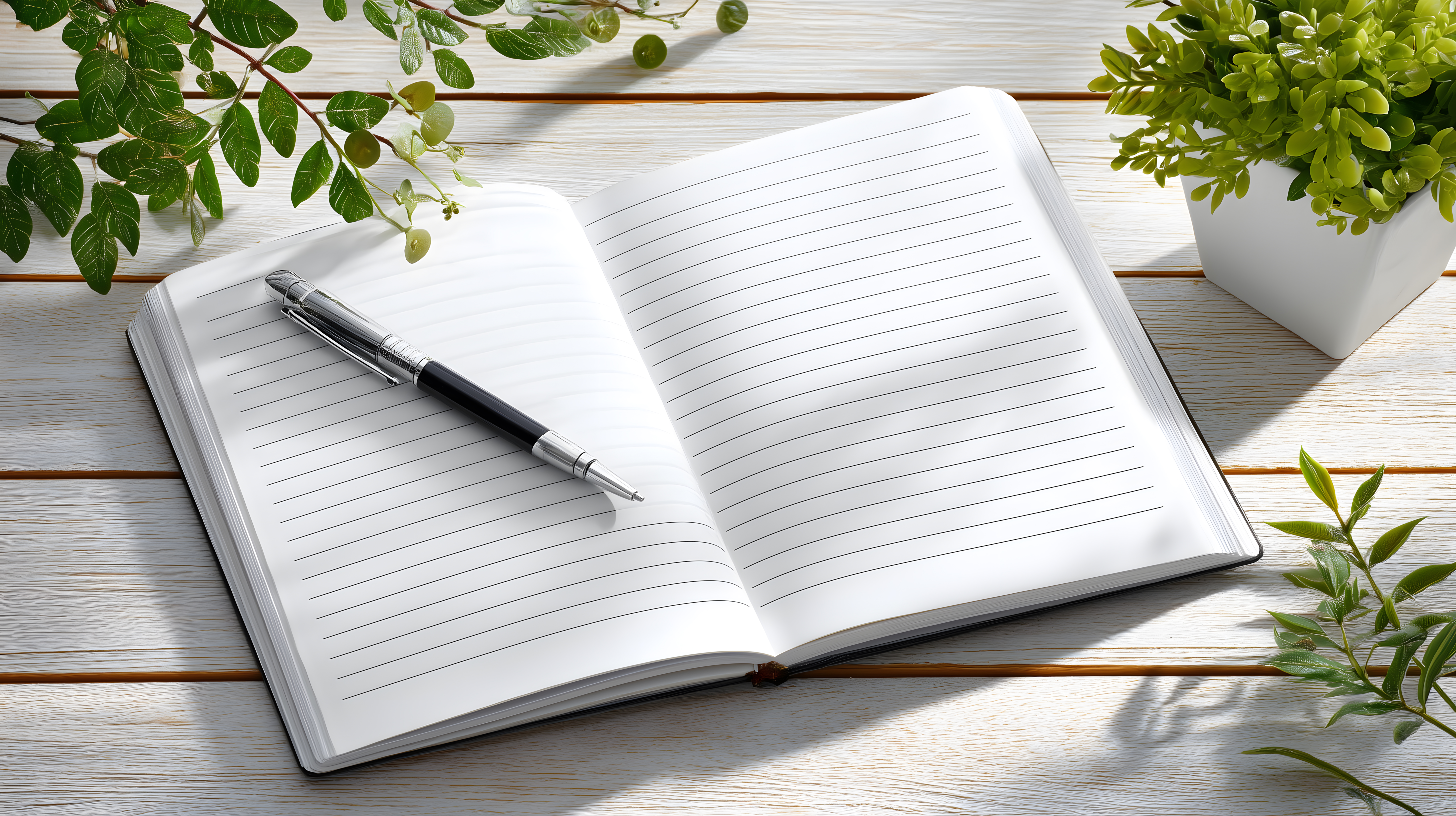 Das Foto zeigt einen Arbeitsplatz auf einem Holztisch, der mit grünen Pflanzen und einer geöffneten Notiz umgeben ist. Im Mittelpunkt des Bildes liegt ein Notizbuch mit Liniatur und einem schwarzen Stift darauf. Die Perspektive ist eine Draufsicht, die den Fokus auf das Schreiben und Notieren lenkt. Die Farbpalette des Fotos besteht aus warmen Holztönen, kühlem Weiß und frischem Grün, was eine natürliche und produktive Stimmung vermittelt.