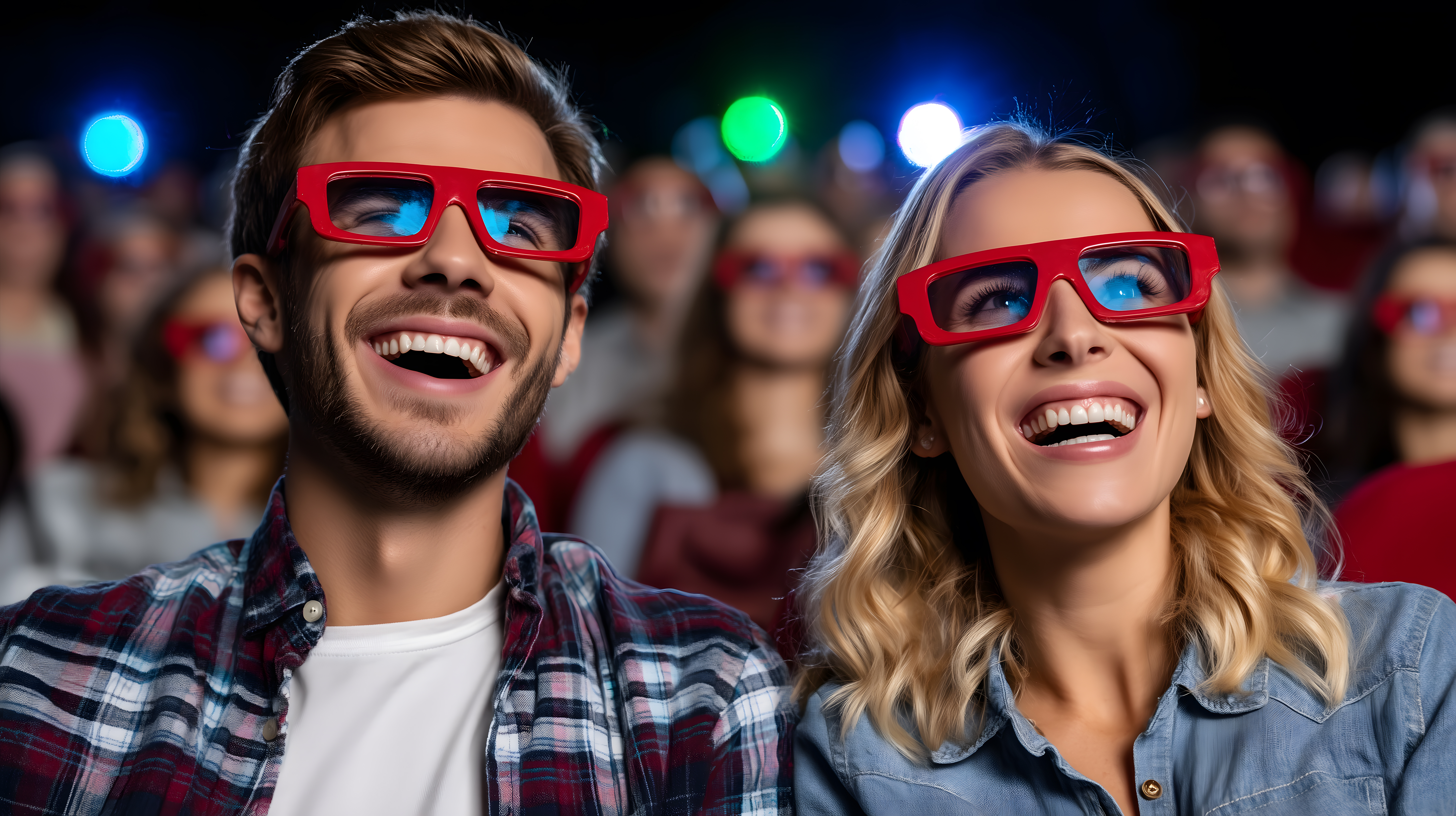 Das Bild zeigt ein lächelndes junges Paar, das eine 3D-Brille trägt und in einer lebendigen, bunt beleuchteten Umgebung zu sehen ist. Die roten Brillen lassen auf eine spannende, interaktive Unterhaltungserfahrung schließen, bei der die beiden Personen in eine virtuelle Welt eintauchen. Die Nahaufnahme der Gesichter und die dynamische Perspektive erzeugen einen unmittelbaren Eindruck von Freude und Begeisterung.