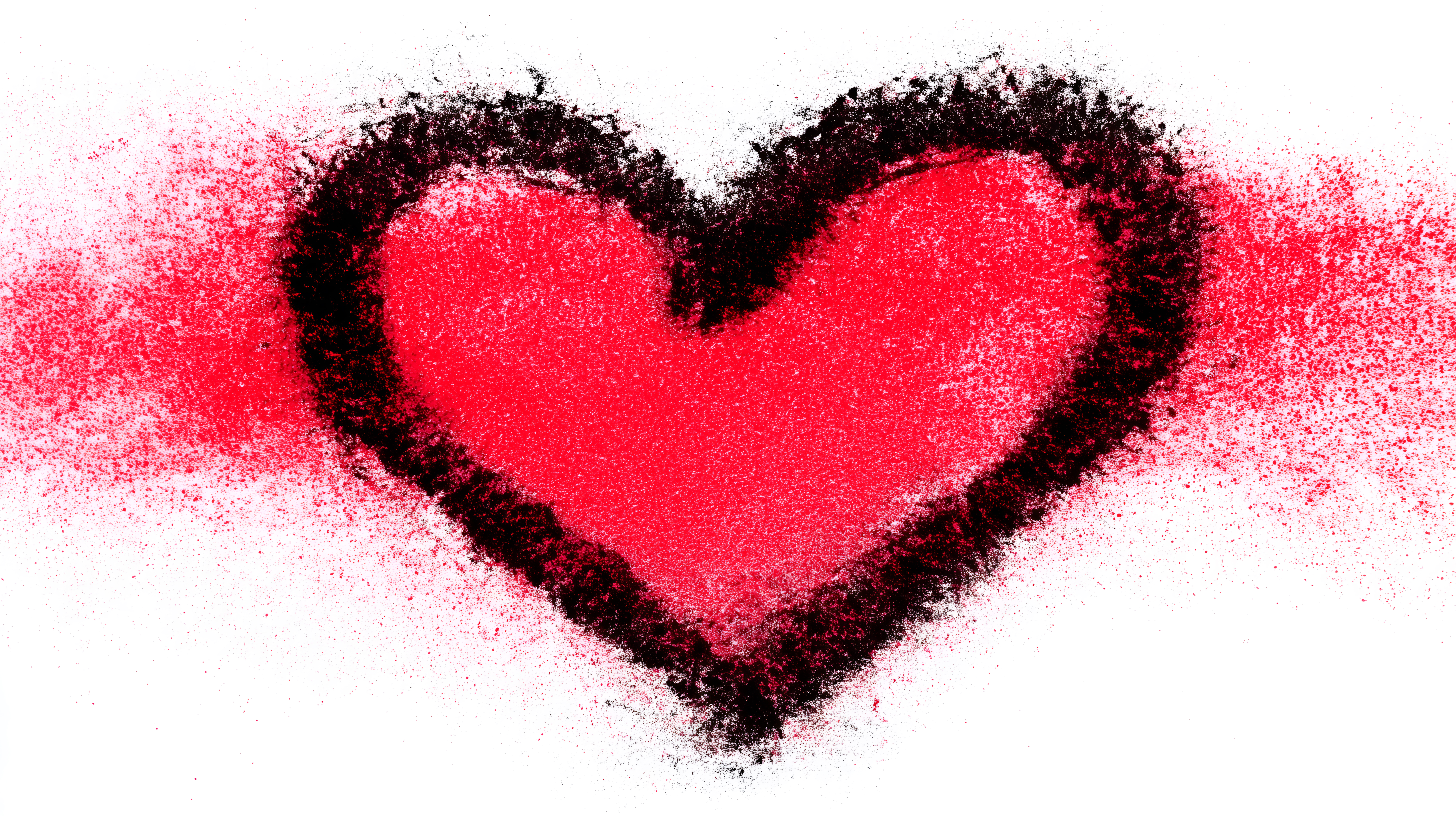 Das Bild zeigt ein großes, rotes Herz-Symbol, das von einem schwarzen, spritzenden Rand umgeben ist. Die Oberfläche des Herzens ist glatt und glänzend, während der Rand eine körnige, texturierte Struktur aufweist. Die Farbpalette ist kräftig und kontrastreich, mit intensivem Rot und Schwarz, was eine emotionale und leidenschaftliche Stimmung vermittelt.