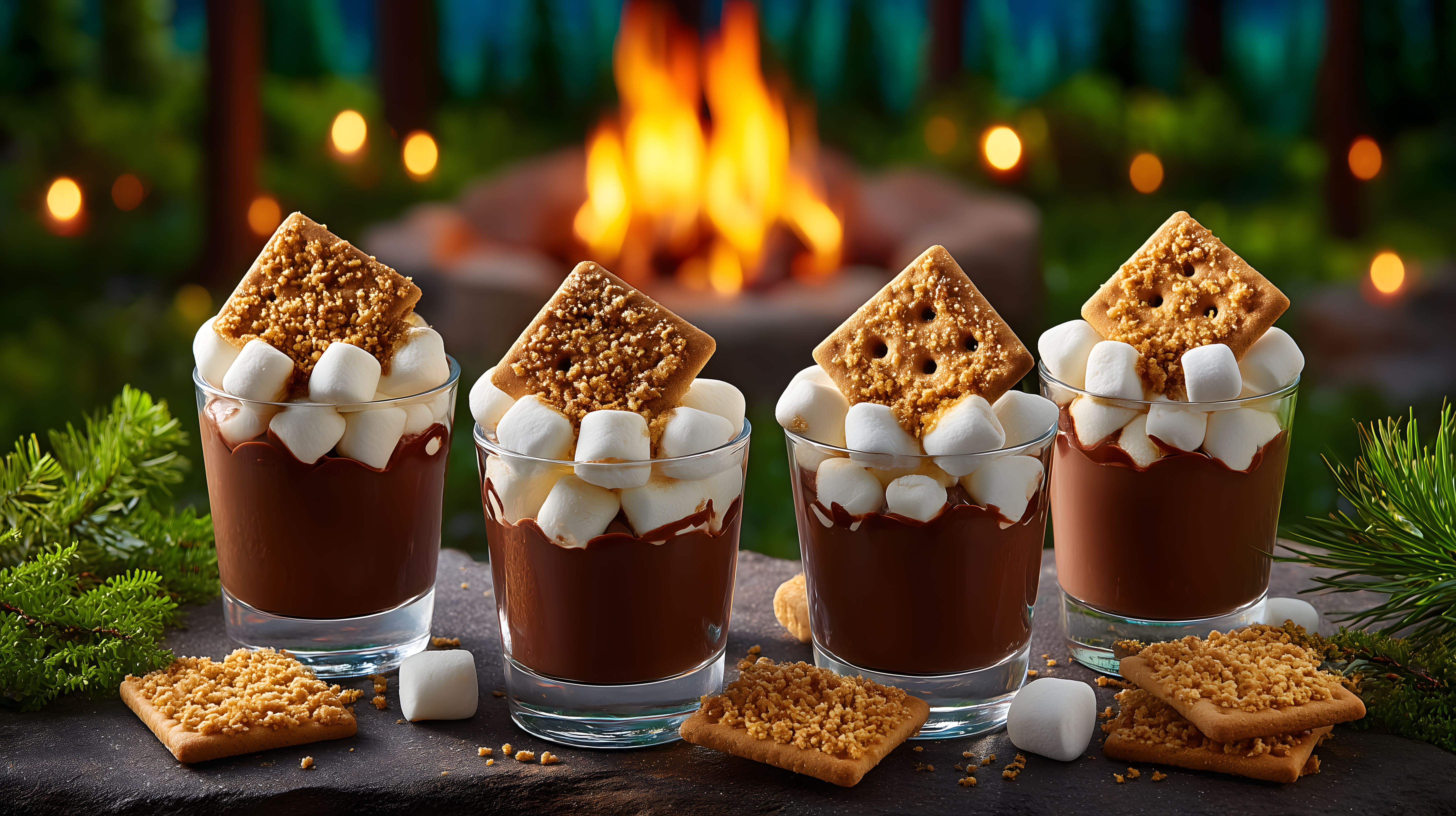 Das Bild zeigt eine Reihe von Getränken in Gläsern, die mit Marshmallows und knusprigen Keksen dekoriert sind. Im Hintergrund ist ein prasselndes Feuer zu sehen, was eine gemütliche, winterliche Stimmung verleiht. Die Komposition ist ausgewogen und die Farbpalette besteht aus warmen, erdigen Tönen, die durch das orangefarbene Feuer noch verstärkt werden.