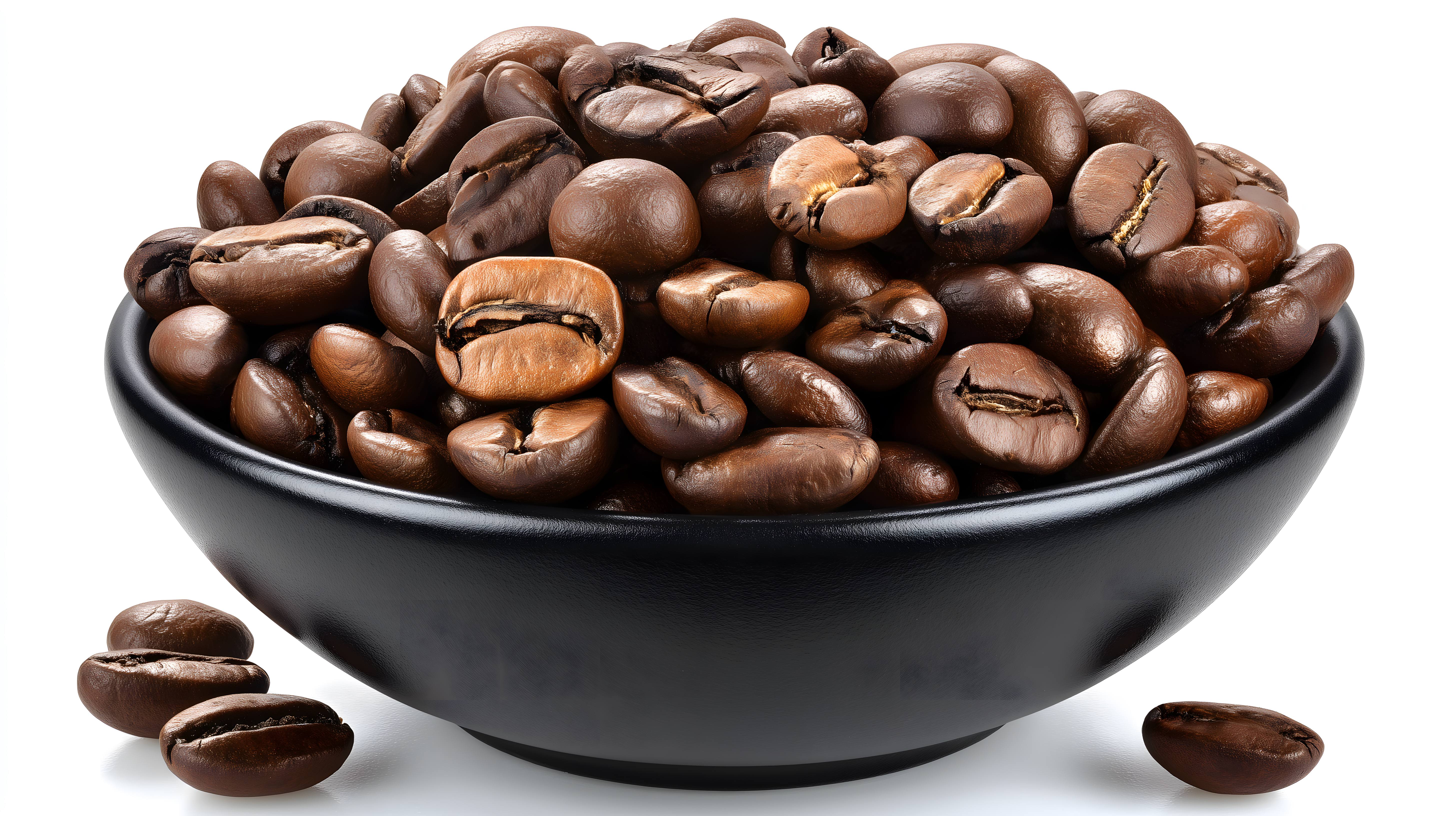 Das Bild zeigt eine Nahaufnahme von einer Schale voll mit gerösteten Kaffeebohnen. Die Kaffebohnen sind in einer schwarzen Schale angeordnet, die einen perfekten Kontrast zu den dunklen, glänzenden Bohnen bildet. Die Perspektive ist eine Draufsicht, die die Fülle und Textur der Kaffeebohnen hervorhebt. Die Farbpalette ist hauptsächlich in Brauntönen gehalten, was eine warme und einladende Atmosphäre schafft.