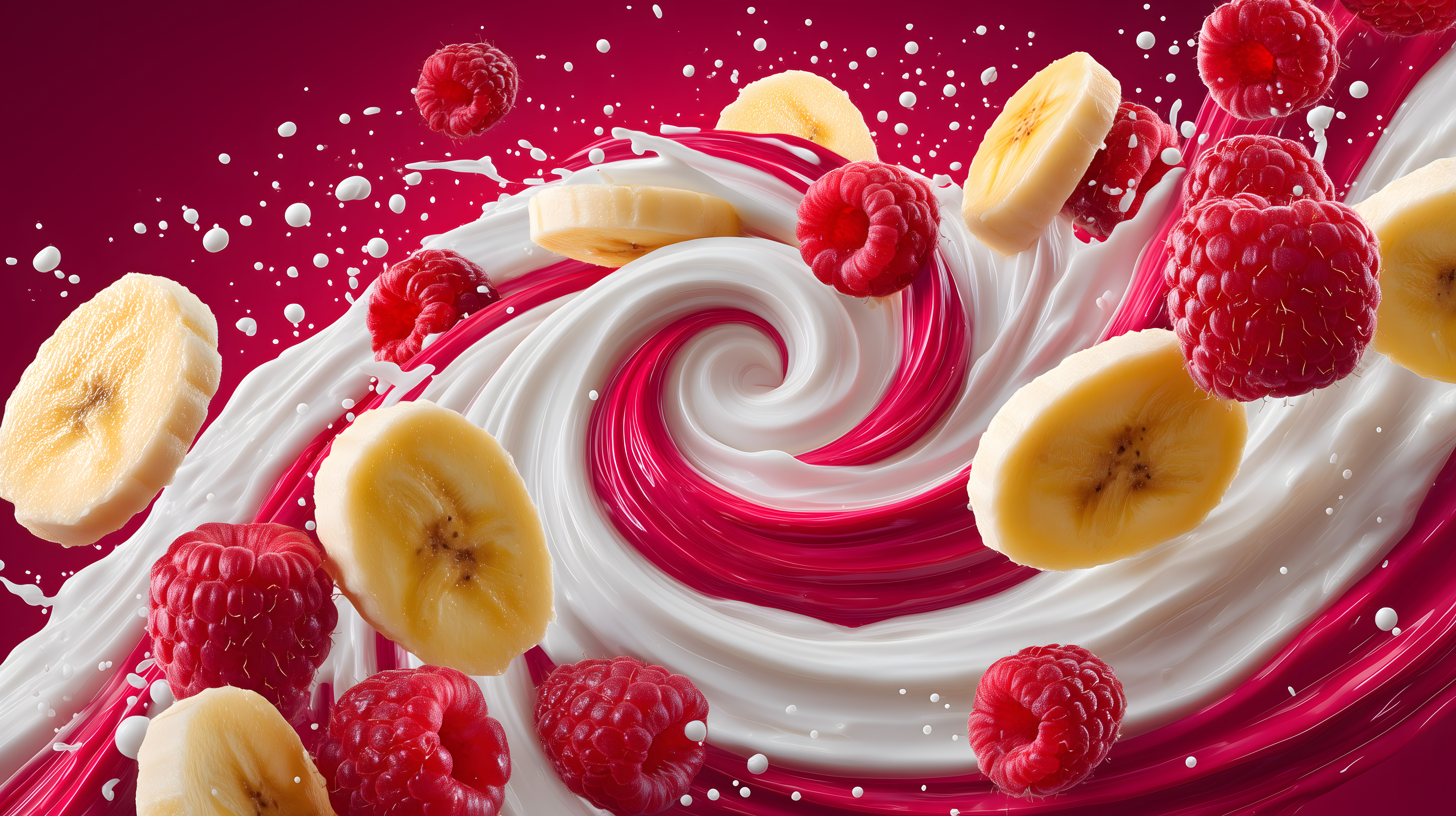 Das Foto zeigt eine lebendige und appetitanregende Komposition von frischen Früchten und cremiger Textur auf einem roten Hintergrund. Die Kamera nimmt eine Draufsicht auf eine spiralförmige, wirbelnde Anordnung von Himbeeren, Bananen, Zitrusfrüchten und einem cremigen, pinken Swirl ein. Die Farben und Formen erzeugen eine dynamische und einladende Darstellung, die den Betrachter zum Genießen einlädt.