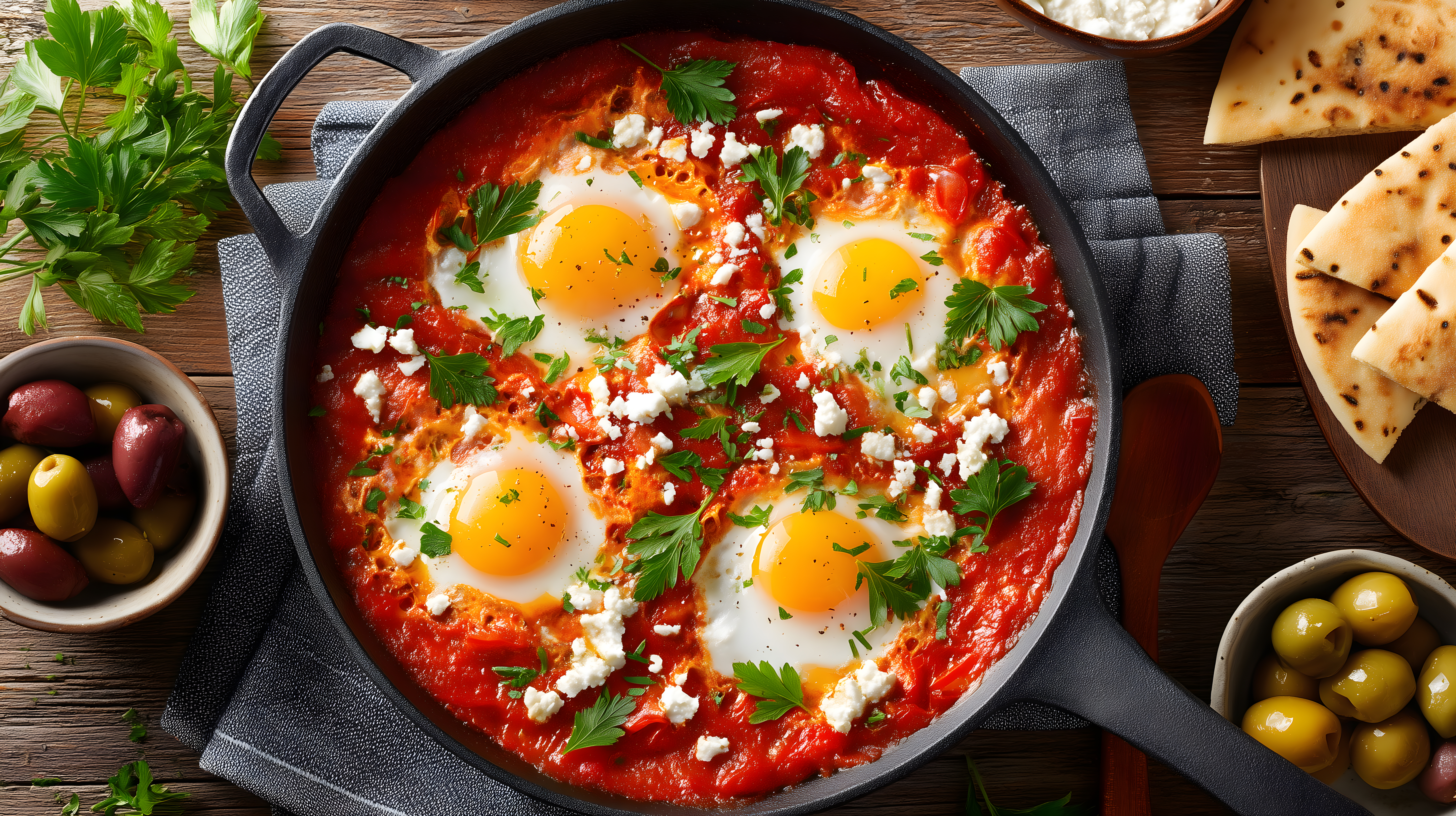 Das Foto zeigt eine nahaufnahme von einem traditionellen Gericht, das in einer schwarzen gusseisernen Pfanne serviert wird. Das Gericht besteht aus gekochten Eiern, die in einer roten, kräftigen Tomatensauce schwimmen und mit frischen Kräutern sowie Fetakäse garniert sind. Die Komposition des Bildes ist sehr harmonisch, mit einer ausgewogenen Farbpalette von tiefen Rottönen, zarten Gelbtönen und frischem Grün. Das Foto bietet eine appetitliche und authentische Darstellung einer mediterranen Speise, die ideal für Kochrezepte, Restaurantmenüs oder Foodfotografie-Projekte geeignet wäre.