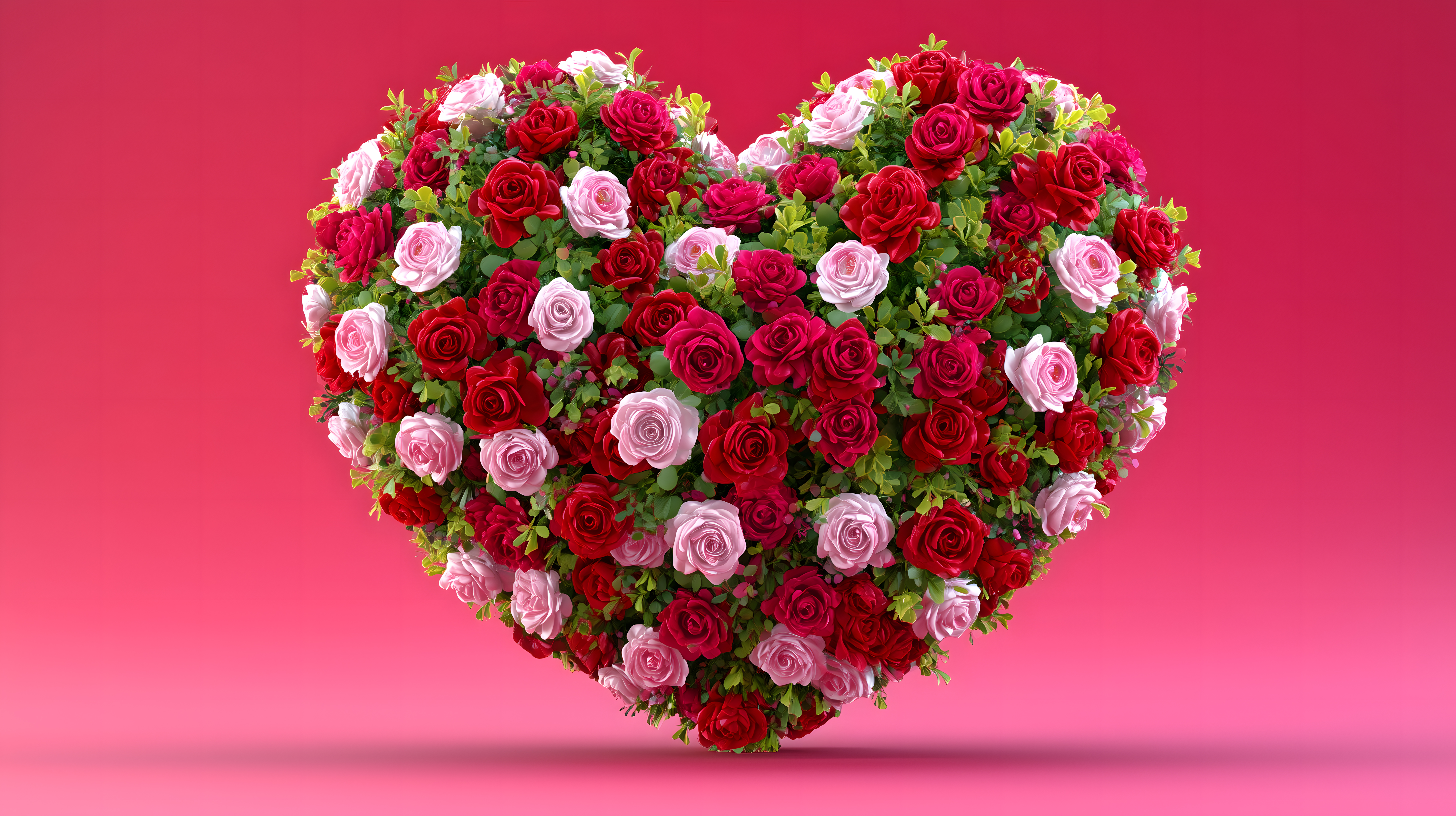 Das Bild zeigt einen kunstvoll gestalteten Herz-förmigen Blumenstrauß, der aus unzähligen roten und rosafarbenen Rosen zusammengesetzt ist. Die Blumen sind vor einem intensiv pinken Hintergrund arrangiert, wodurch der Kontrast zwischen dem satten Rot der Rosen und dem kräftigen Farbton des Hintergrunds besonders hervorgehoben wird. Die Komposition ist symmetrisch und wirkt sehr harmonisch, wobei die Rosen dicht beieinander stehen und eine einheitliche, blühende Masse bilden.