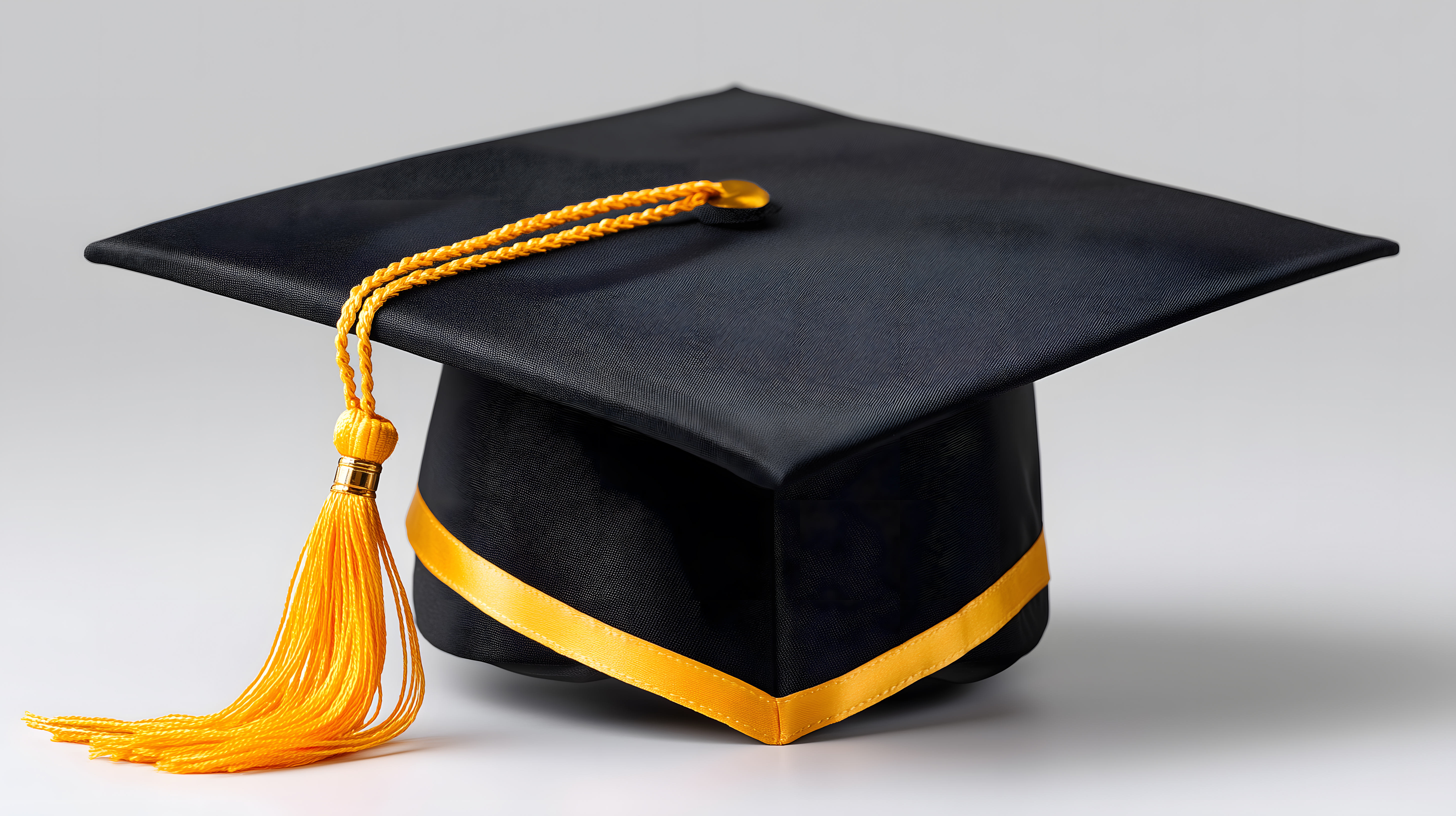 Das Bild zeigt eine Nahaufnahme eines schwarzen Doktorhuts mit einem gelben Quaste-Detail. Der Hut ist auf einer grauen Oberfläche platziert, was den Fokus auf das Hauptmotiv lenkt. Die Farbpalette beschränkt sich auf Schwarz, Gelb und verschiedene Grautöne, was einen edlen und akademischen Eindruck vermittelt.