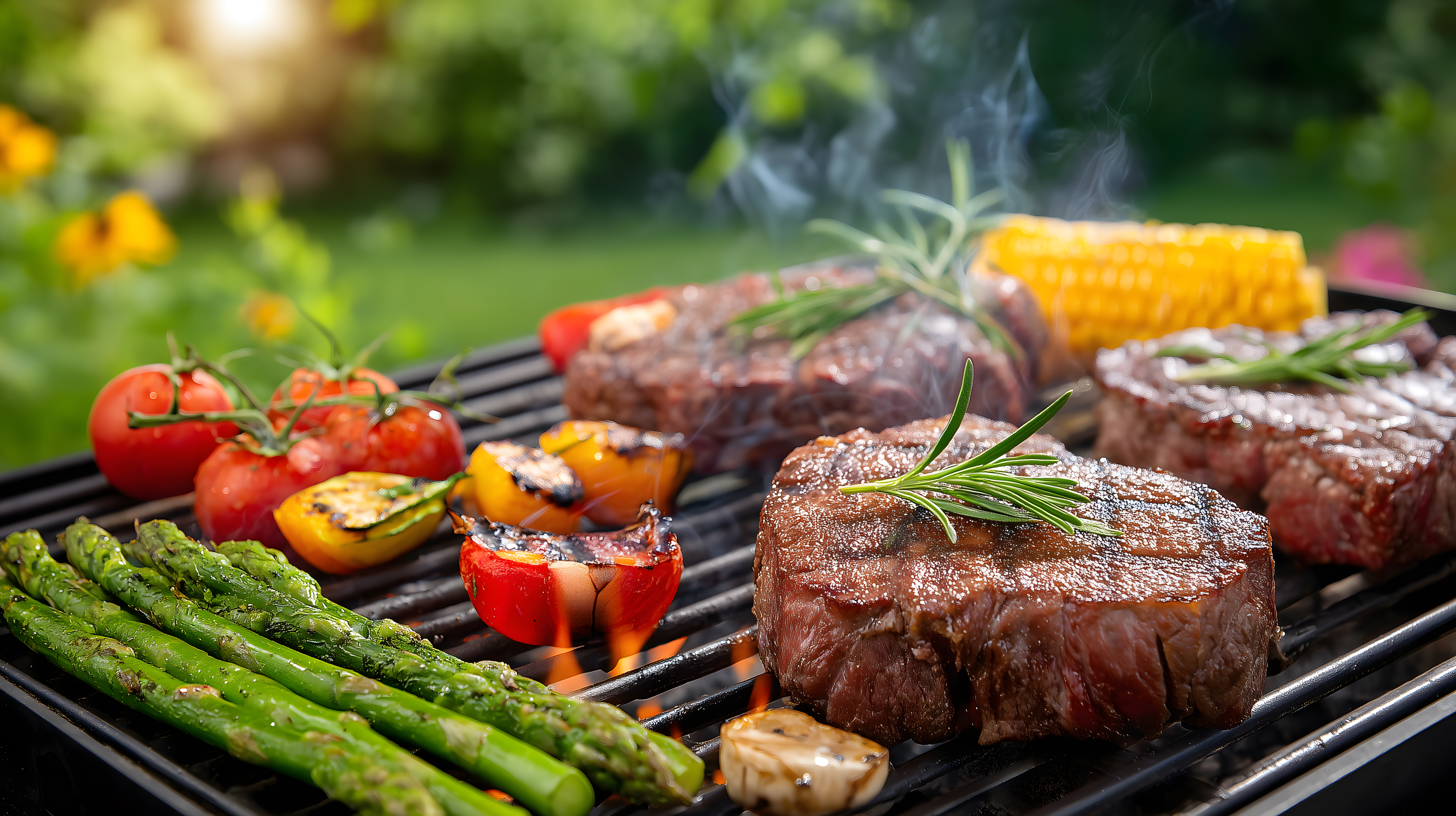 Das Bild zeigt eine Grillplatte mit verschiedenen gegrillten Fleischstücken, Gemüse und Gewürzen. Die Platte ist in einer naturnahen Umgebung mit unscharfem Hintergrund aus grünen Blättern und Pflanzen platziert, was eine stimmungsvolle, sommerliche Atmosphäre vermittelt. Die Nahaufnahme legt den Fokus auf die appetitlichen, dampfend heißen Grillspezialitäten.