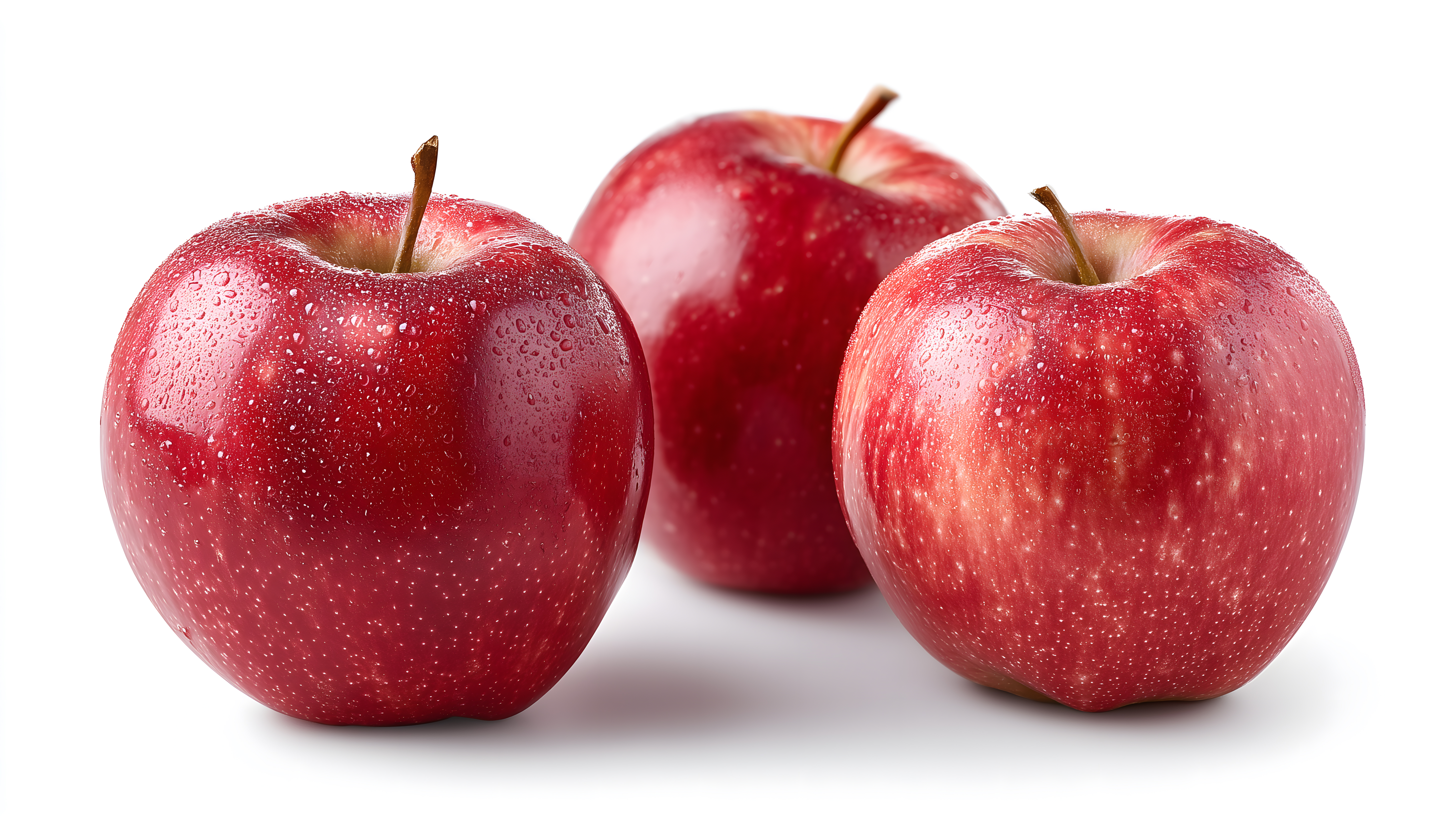 Das Bild zeigt drei leuchtend rote Äpfel mit glänzenden Oberflächen und zahlreichen Wassertropfen. Die Äpfel sind in einer Nahaufnahme aus der Draufsicht fotografiert, wodurch ihre Struktur und Textur deutlich sichtbar werden. Die klaren Konturen, die intensive Färbung und der starke Kontrast zum weißen Hintergrund machen die Äpfel zum Blickfang.
