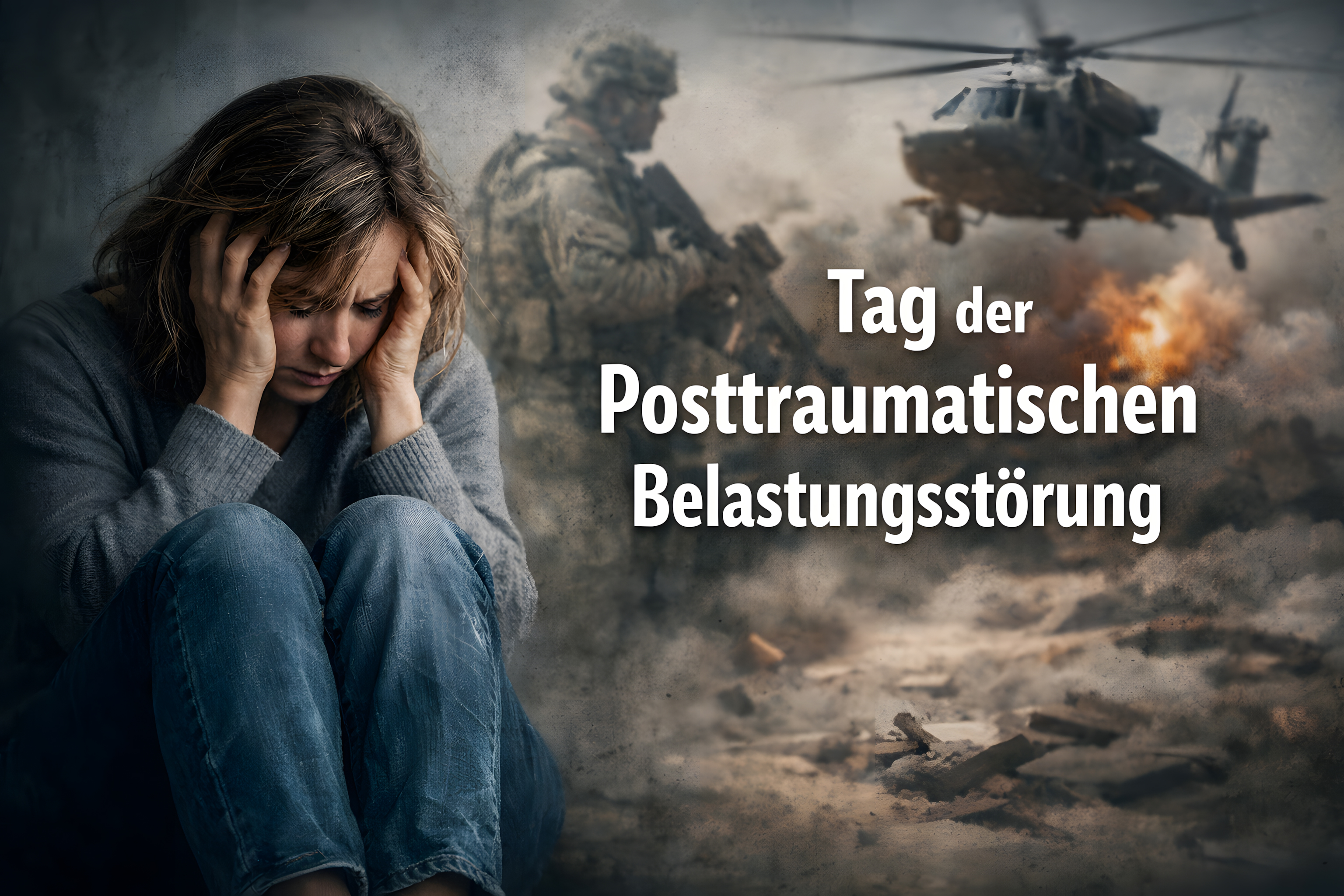 Dieses Foto gibt einen tiefen Einblick in die psychischen Folgen von Kriegserlebnissen und traumatischen Erfahrungen. Es zeigt einen Soldaten in einer tiefen Krise, die Hände verzweifelt im Gesicht vergraben. Im Hintergrund sind Helikopter und Explosionen zu sehen - Symbole des Kampfgeschehens, das offenbar Spuren in der Psyche des Mannes hinterlassen hat.