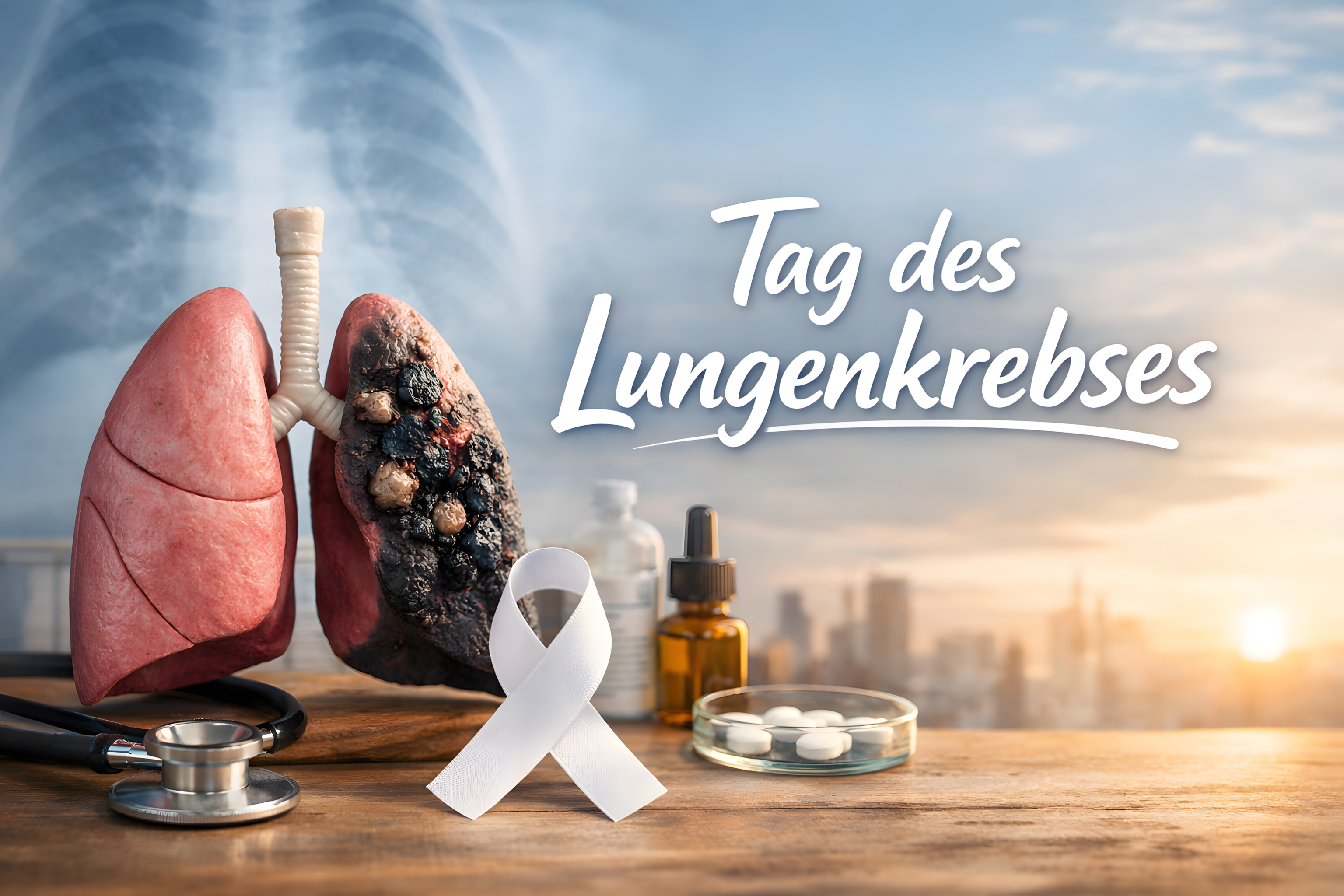 Das Bild zeigt einen symbolischen Hintergrund für den Tag des Lungenkrebses, um das Bewusstsein für diese Krankheit zu schärfen und über Prävention, Diagnose und Behandlungsmöglichkeiten zu informieren. Im Vordergrund sind Elemente der Lungengesundheit zu sehen: ein Röntgenbild der Lunge, eine rote Schleife als Lungenkrebs-Symbol und medizinisches Zubehör wie ein Stethoskop. Der Hintergrund zeigt eine Großstadt-Skyline bei Sonnenuntergang, was auf eine ökologische Komponente und den Fortschritt in der Krebsforschung hinweisen kann.