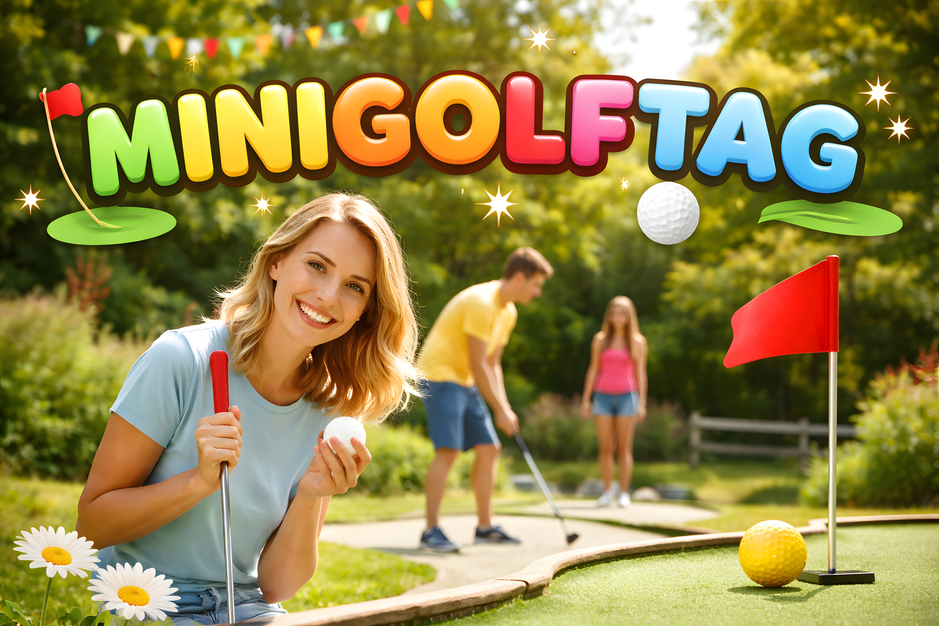 Das Foto zeigt eine fröhliche Szene bei einem Minigolf-Tag im Freien. Eine lächelnde junge Frau steht mit einem Minigolf-Schläger in der Hand auf einer bunt gestalteten Minigolf-Bahn, umgeben von sommerlicher Natur. Im Hintergrund sind weitere Personen zu sehen, die ebenfalls mit Spaß und Geschicklichkeit dem Spiel nachgehen.