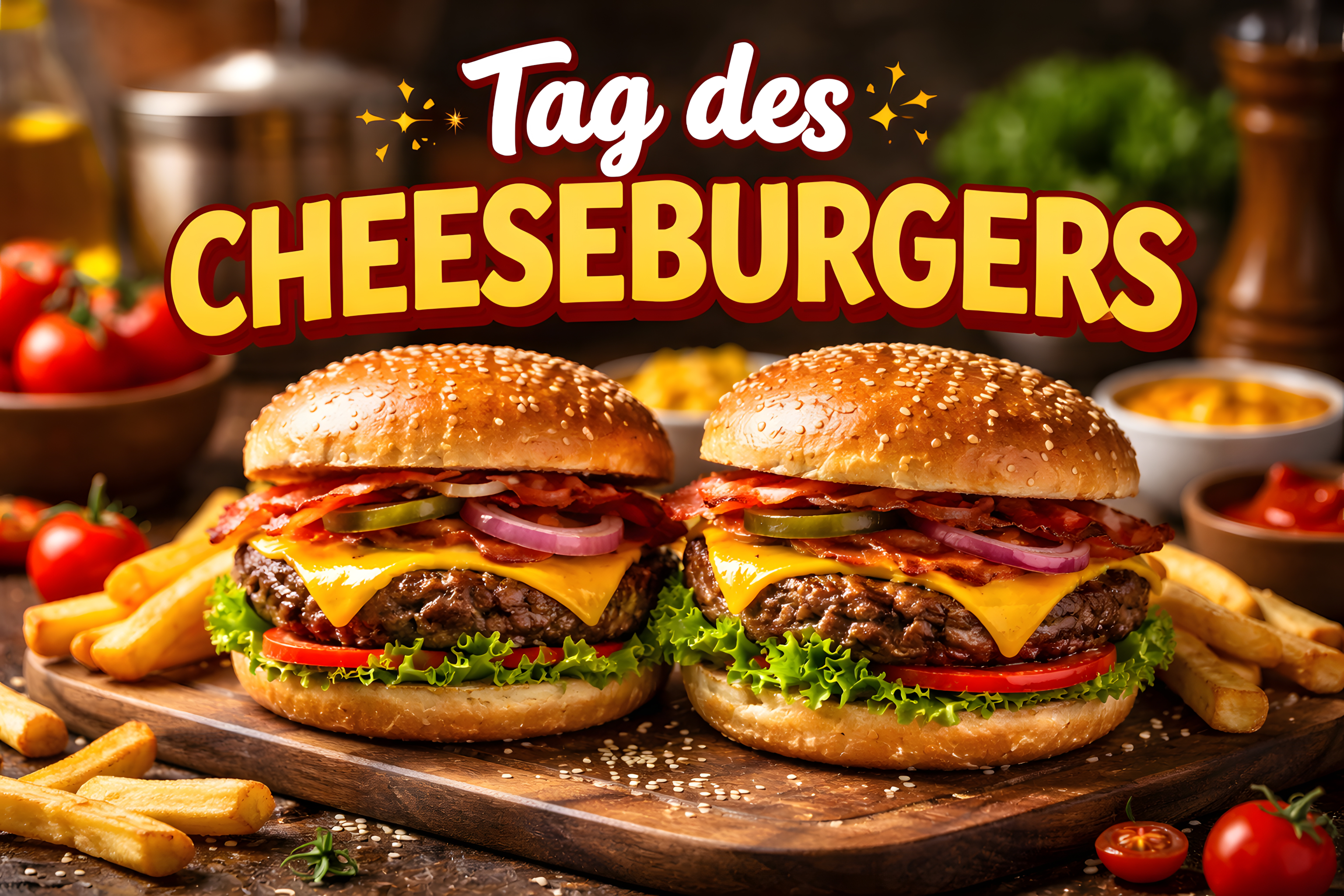 Das Bild zeigt zwei köstliche Cheeseburger, die auf einem Holzbrett angerichtet sind. Die Burger sind mit einer Vielzahl an leckeren Zutaten belegt, wie saftigem Fleisch, schmelzendem Käse, frischen Tomaten, knackigem Salat und knusprigen Zwiebeln. Dazu werden knusprige Pommes Frites serviert, die den Genuss perfekt abrunden. Der dunkle Hintergrund lässt die appetitlichen Burger umso stärker hervortreten und verleiht dem Bild eine einladende, kulinarische Atmosphäre.