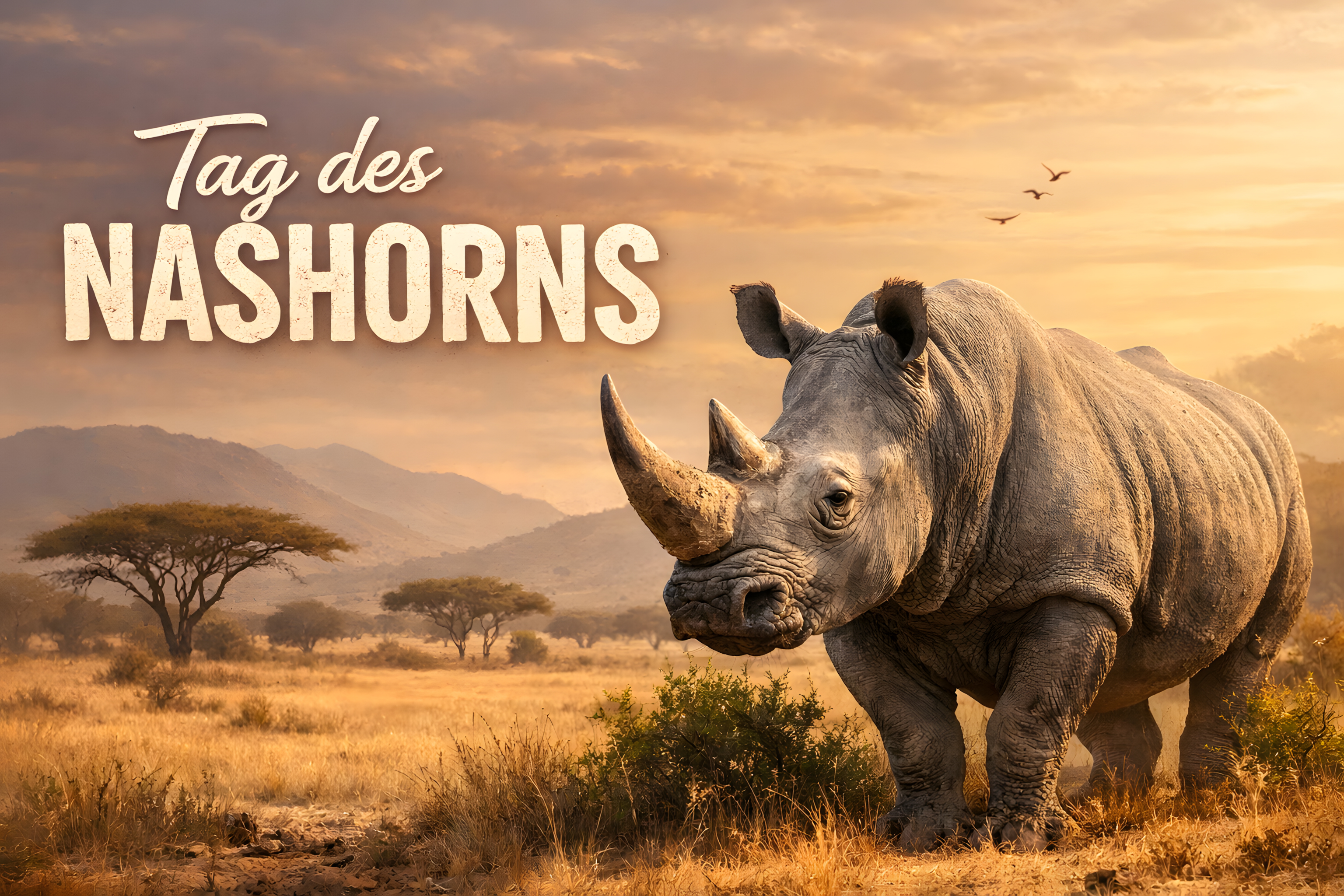 Dieses beeindruckende Foto zeigt ein imposantes Breitmaulnashorn vor einer herrlichen Savannenlandschaft im Abendlicht. Das mächtige Tier steht inmitten der typischen Vegetation aus Akazien und anderen Sträuchern, die sich vor einem dramatischen orangeroten Himmel mit fliegenden Vögeln abzeichnen. Die ruhige, fast schon meditative Stimmung vermittelt einen Eindruck von Weite, Freiheit und der Schönheit der afrikanischen Tierwelt. Das Nashorn, eines der bekanntesten Symbole des Naturschutzes, dient hier als Blickfang und Motiv für verschiedenste Einsatzzwecke - vom Blog-Beitrag über Social-Media-Posts bis hin zu Präsentationen oder Newsletterbeiträgen. Das Foto bietet viele Möglichkeiten, um die Faszination der afrikanischen Savanne und den Schutz bedrohter Tierarten zu thematisieren.