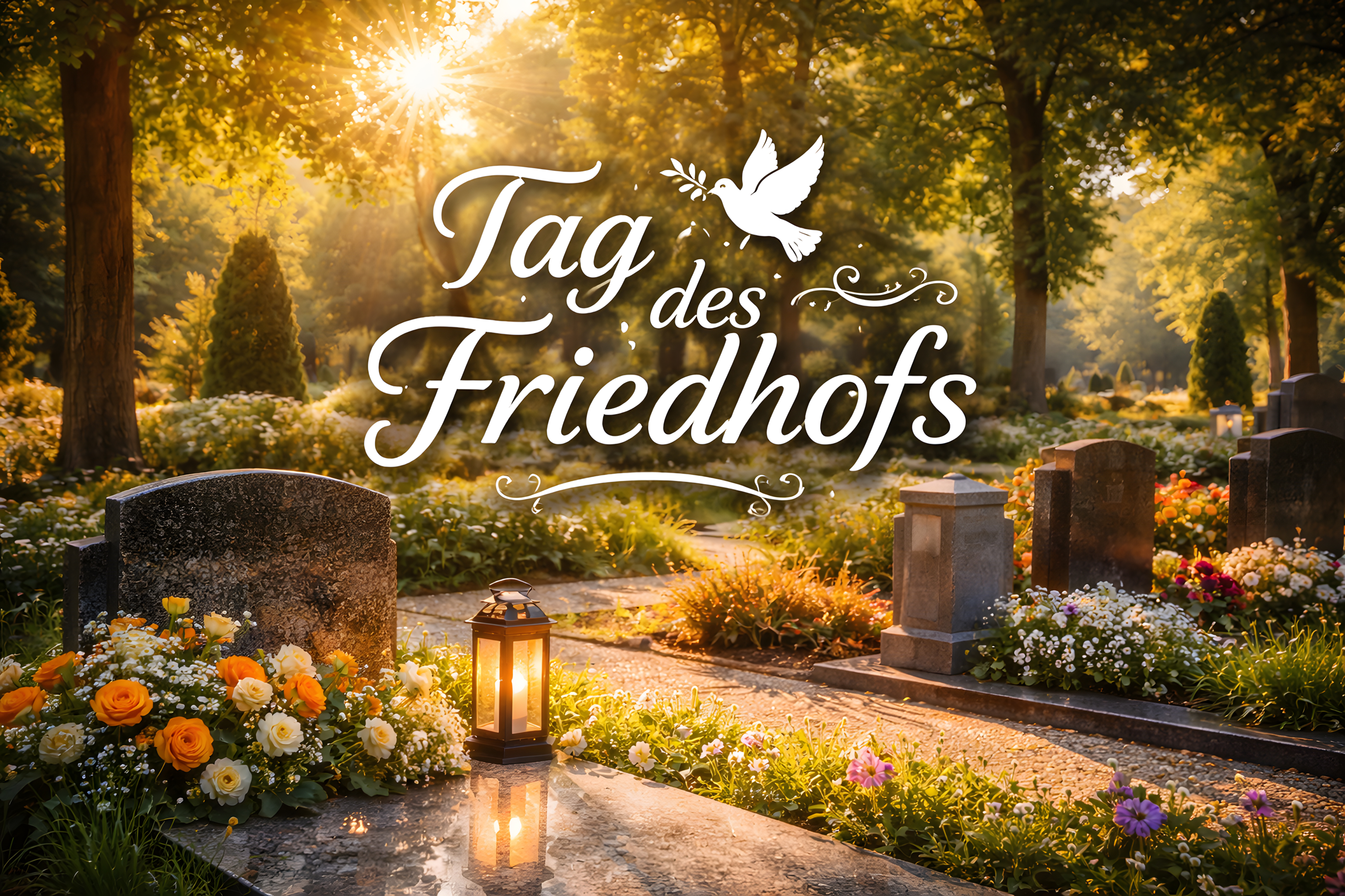 Das Foto zeigt einen malerischen Friedhofsgarten, der in das warme, goldene Licht des Herbstes getaucht ist. Der Pfad windet sich durch eine idyllische Landschaft, gesäumt von blühenden Blumen, Bäumen und Grabsteinen. Die Sonne bricht durch das Blätterdach und wirft ein warmes Licht auf die Szene, das eine stimmungsvolle und meditative Atmosphäre schafft. Das Bild vermittelt eine Mischung aus Ruhe, Trauer und Erinnerung - ein würdevoller Ort des Gedenkens. Diese Aufnahme eignet sich hervorragend für die Verwendung in Magazinen, Blogbeiträgen, Newslettern oder Präsentationen, die sich mit Themen wie Natur, Jahreszeiten, Spiritualität oder Erinnerungskultur befassen.
