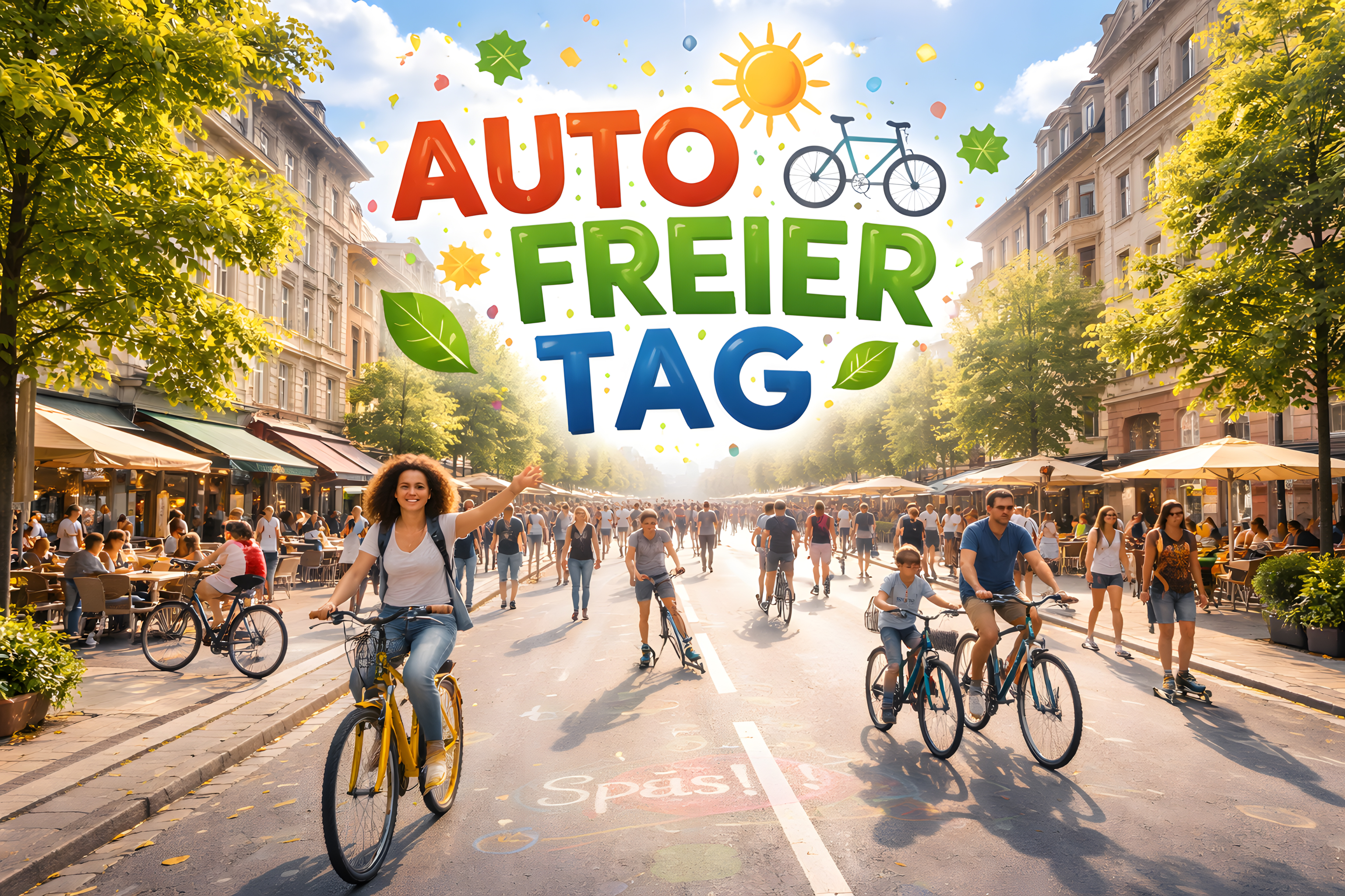 Das Foto zeigt eine belebte Stadtstraße an einem autofreien Tag. Im Mittelpunkt stehen Menschen, die auf Fahrrädern und zu Fuß die Straße entlanggehen, an Cafés und Geschäften vorbeiflanieren und die Atmosphäre des autofreien Tages genießen. Die Szene ist von sommerlicher Stimmung geprägt - Sonne, Bäume und bunte Dekorationen tragen dazu bei. Es herrscht eine entspannte, fröhliche Stimmung, die den Genuss des urbanen Lebens ohne Autos widerspiegelt.
