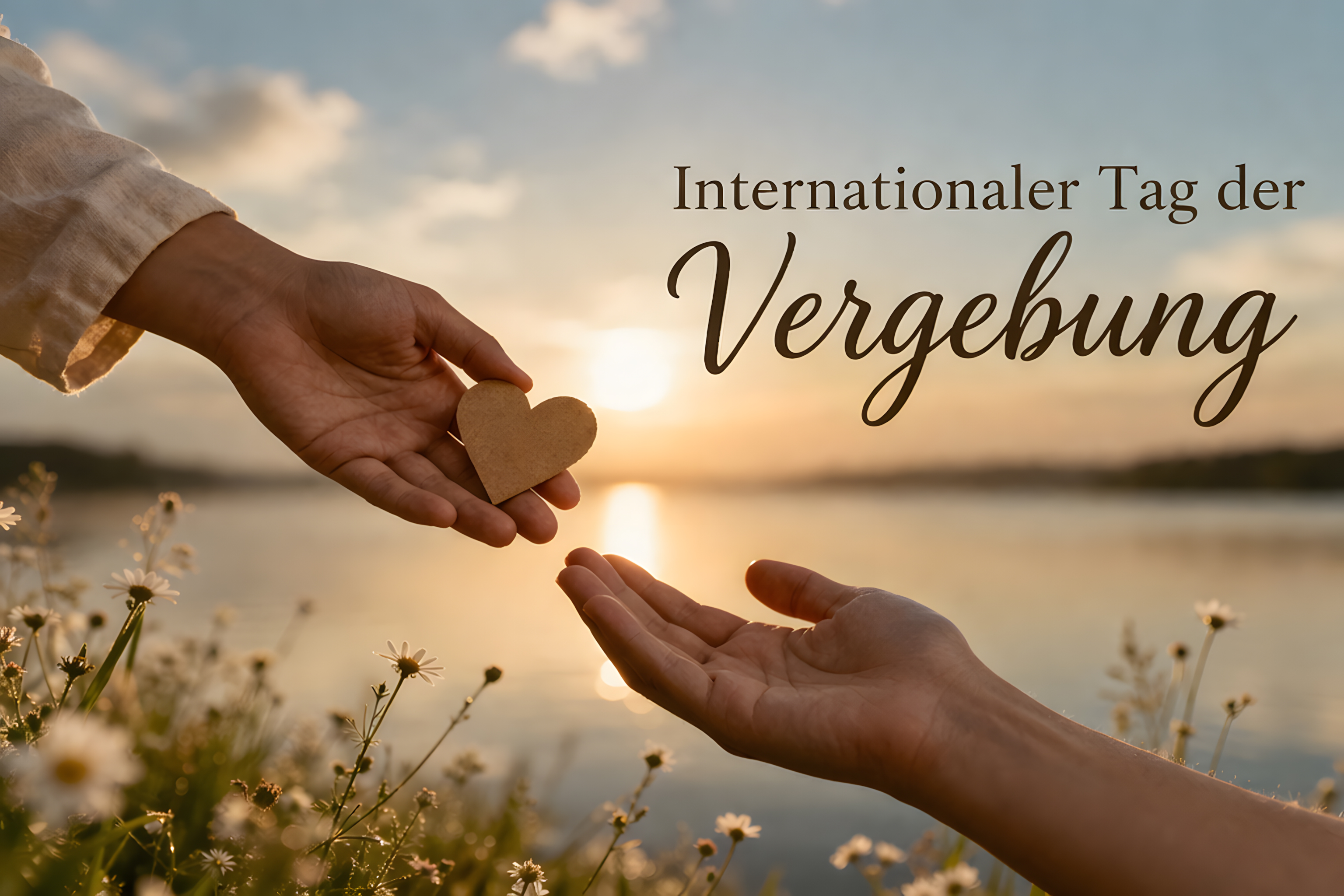 Das Bild zeigt zwei Hände, die sich in einem malerischen Sonnenuntergang über einem See mit Blumen im Vordergrund begegnen. Die Komposition vermittelt eine friedvolle, versöhnliche Stimmung und symbolisiert den Internationalen Tag der Vergebung. Die warmen Farbtöne, die sanfte Beleuchtung und die harmonische Naturkulisse schaffen eine besinnliche, emotionale Atmosphäre.