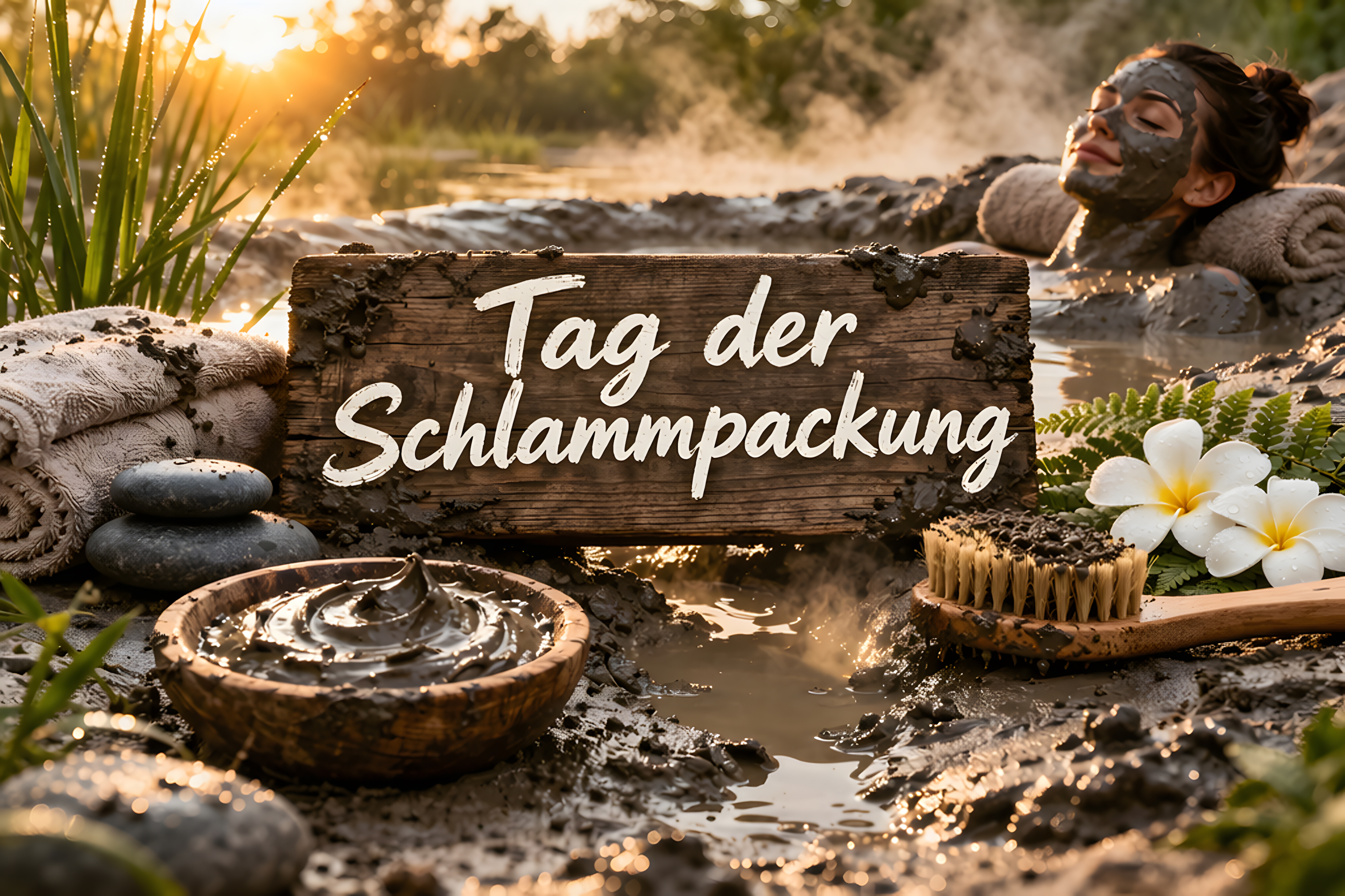 Dieses stimmungsvolle Foto lädt zu einem entspannenden Moment der Selbstfürsorge ein. Es zeigt eine Szene, in der eine Person in eine Schlammpackung eingehüllt ist, umgeben von Naturmaterialien wie Steinen, Blumen und Holzschildern. Die warme, goldene Beleuchtung des Sonnenuntergangs verleiht dem Bild eine besonders friedliche und idyllische Atmosphäre.