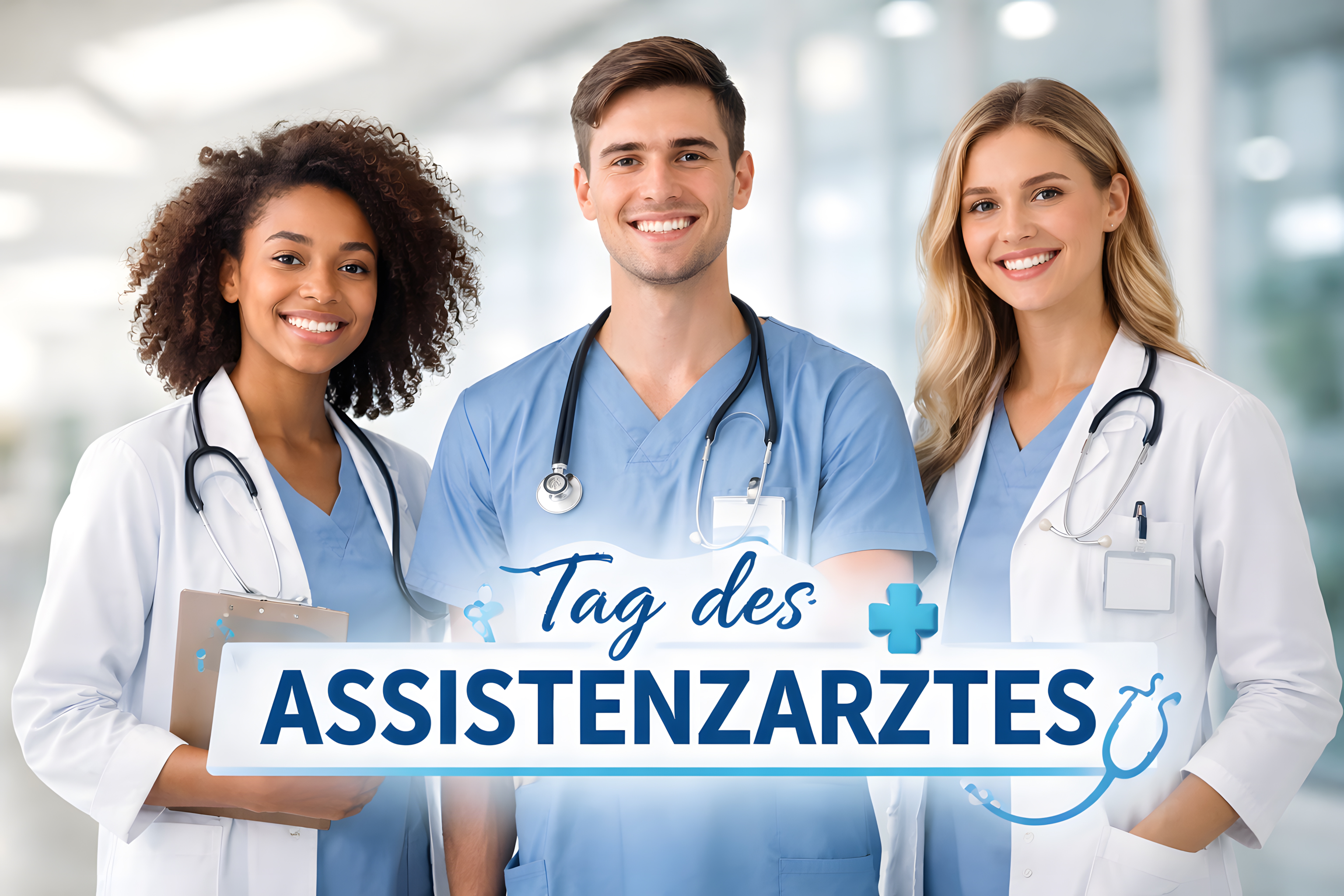 Dieses Foto zeigt ein fröhliches und professionelles Ärzteteam in einem modernen Krankenhaus-Umfeld. Die drei Mediziner - eine Ärztin mit lockigem, dunklem Haar, ein Arzt mit kurzen, braunen Haaren und eine weitere Ärztin mit langen, blonden Haaren - lächeln in die Kamera und stehen gemeinsam vor einer hellen, gläsernen Kulisse.