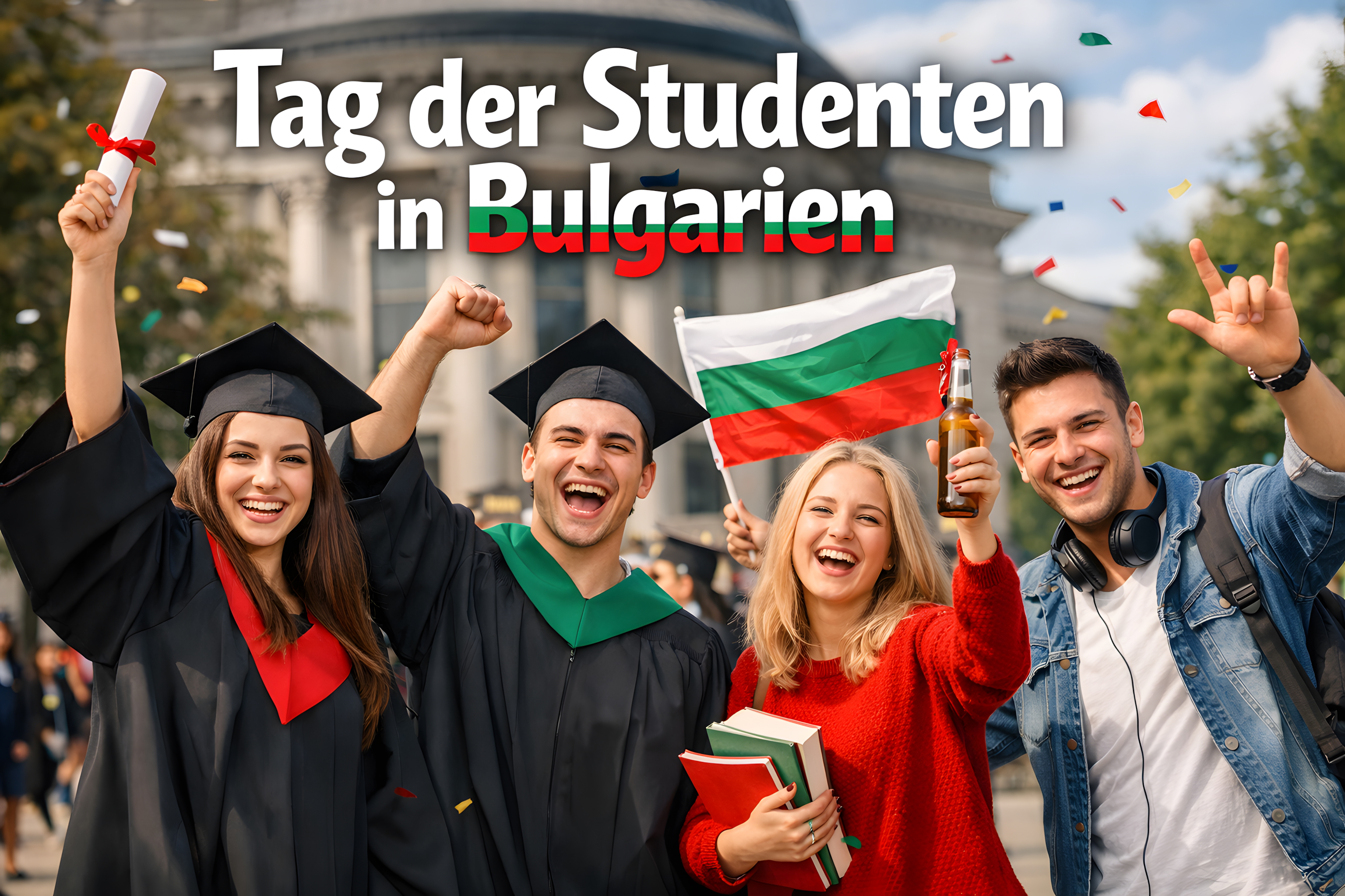 Das Foto zeigt eine Gruppe feiernder Studenten bei einer Veranstaltung zum Tag der Studenten in Bulgarien. Die jungen Leute in Abschlussroben und Barretts schwenken stolz die bulgarische Flagge und jubeln enthusiastisch. Ihre strahlenden Gesichter und ausgelassene Stimmung vermitteln die Freude und den Stolz über ihren erfolgreichen Studienabschluss. Die bunte Szenerie mit herumstiebenden Konfetti unterstreicht die festliche Atmosphäre auf dem Universitätscampus. Dieses Bild eignet sich hervorragend, um Inhalte rund um Bildung, Hochschule, Studentenleben und nationale Traditionen in Bulgarien zu illustrieren - sei es in Blogbeiträgen, Social-Media-Posts oder Präsentationen. Es vermittelt Lebendigkeit, Gemeinschaftsgefühl und den Triumph des Lernens.