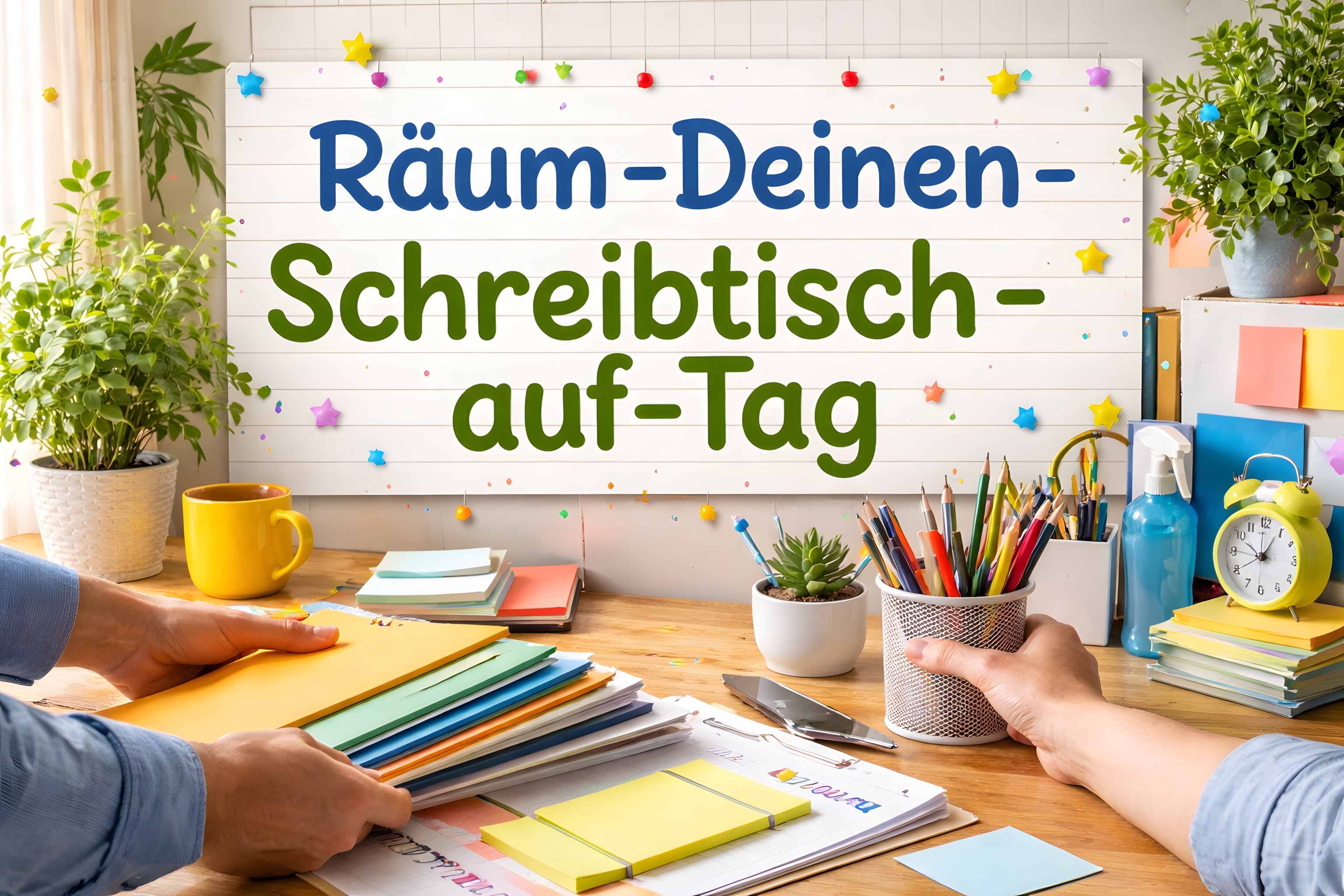 Das Foto zeigt einen aufgeräumten und kreativen Arbeitsplatz. Im Zentrum befindet sich ein Holzschreibtisch, auf dem viele bunte Stifte, Marker, Notizzettel und andere Schreibutensilien arrangiert sind. Daneben steht eine Tasse Kaffee und ein grüner Blumentopf mit Pflanze. An den Wänden hängen dekorative Elemente wie Girlanden, die eine fröhliche Atmosphäre schaffen. Insgesamt vermittelt der Raum einen Eindruck von Ordnung, Produktivität und künstlerischer Inspiration. Der Arbeitsplatz eignet sich perfekt für kreative Tätigkeiten wie Schreiben, Zeichnen oder Präsentationserstellung. Er lässt sich auch in Blogbeiträgen, Social-Media-Posts oder Newslettern zum Thema Produktivität, Büroorganisation oder Arbeitsmotivation einsetzen.