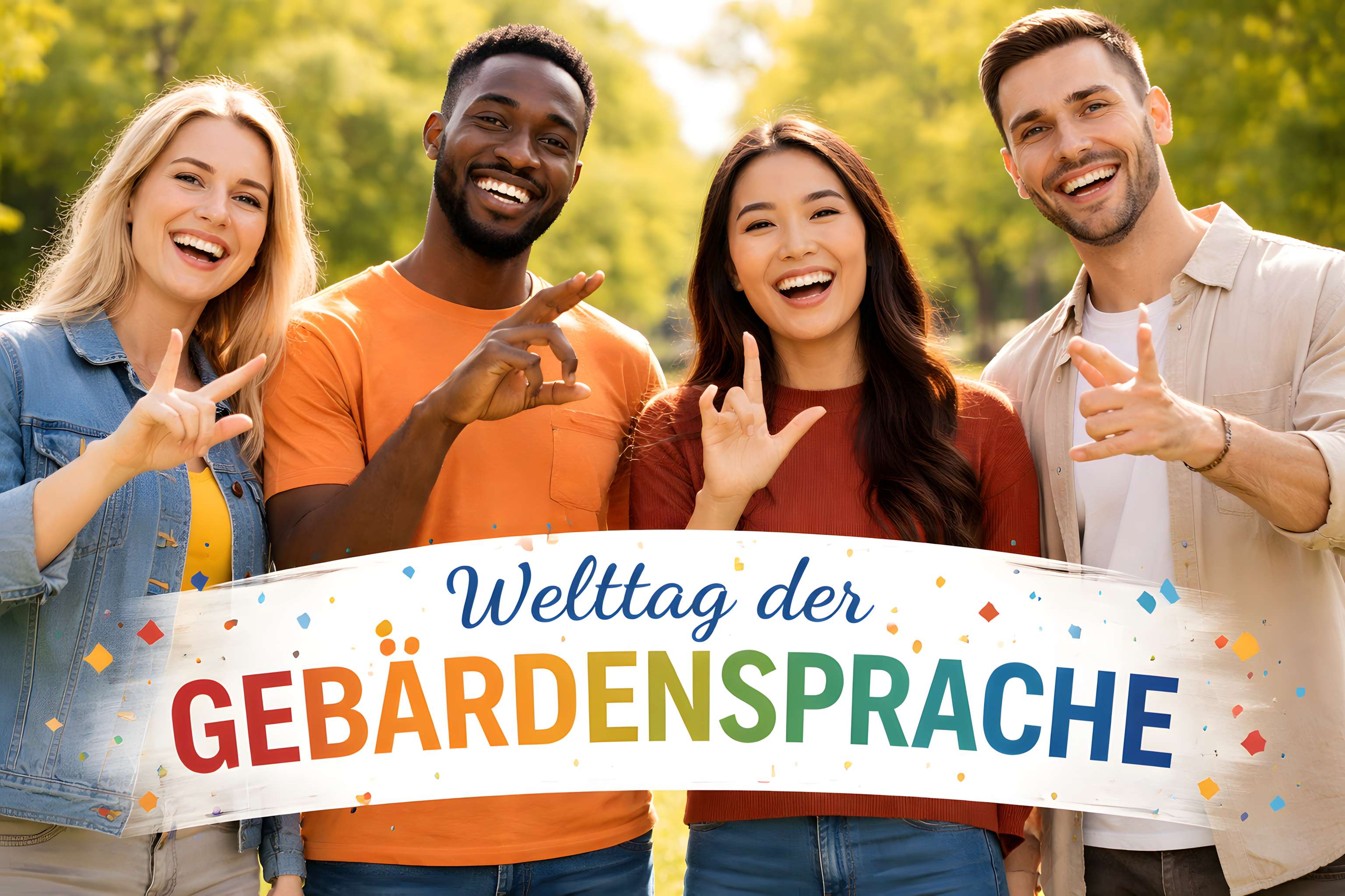 Das Foto zeigt eine Gruppe von vier jungen, fröhlich lachenden Menschen, die gemeinsam einen weißen Banner mit der Aufschrift 'Welttag der Gebärdensprache' halten. Die Personen stehen im Freien vor einem grünen, laubigen Hintergrund und tragen bunte Kleidung. Sowohl Männer als auch Frauen sind in der Gruppe vertreten, was auf Diversity und Inklusion hindeutet. Der Banner signalisiert, dass es sich um eine Werbekampagne oder Präsentation zum Thema Sprachförderung und Mehrsprachigkeit handelt. Das Foto könnte für Social-Media-Beiträge, Websites oder Werbematerialien zum Thema Bildung, Inklusion oder Kommunikation verwendet werden.